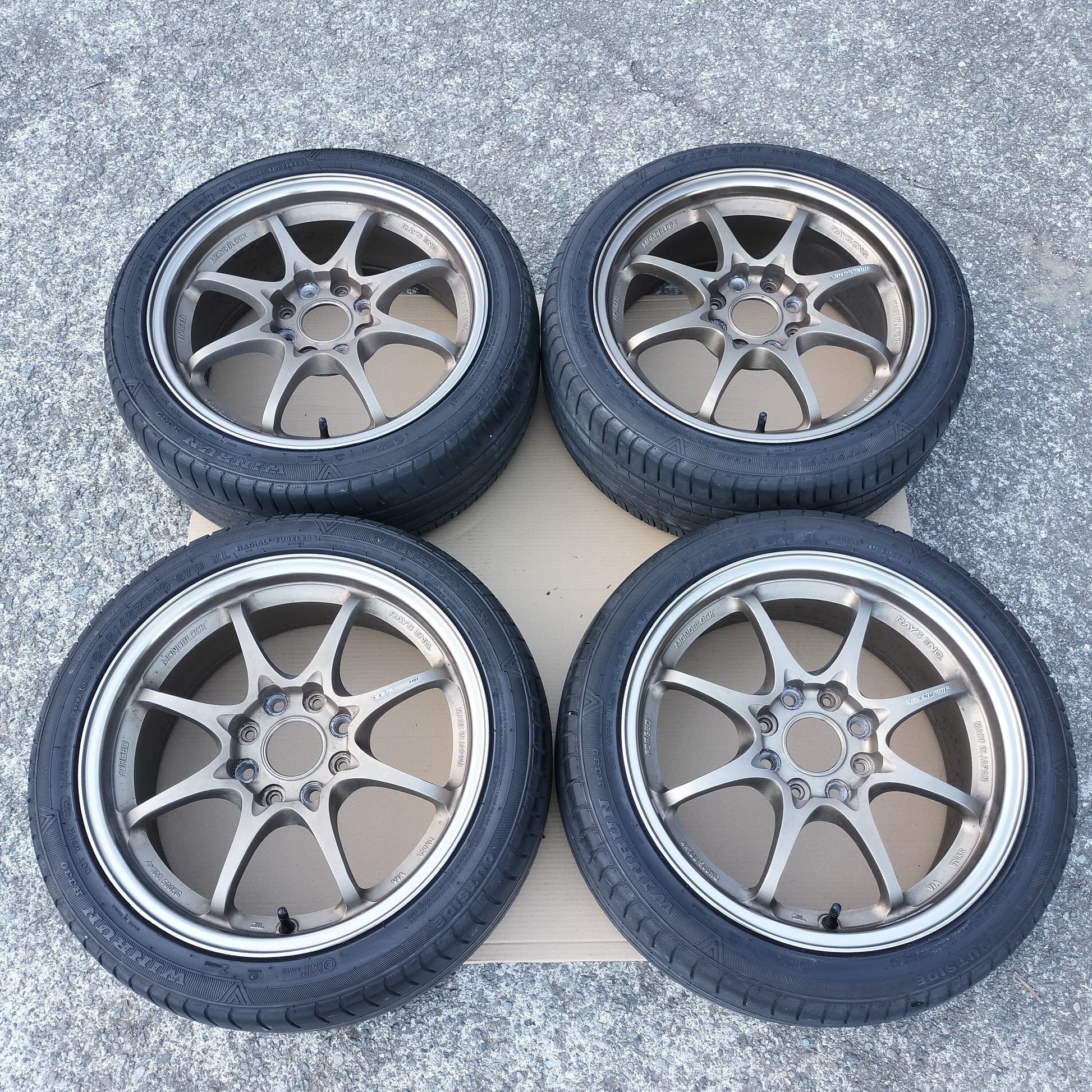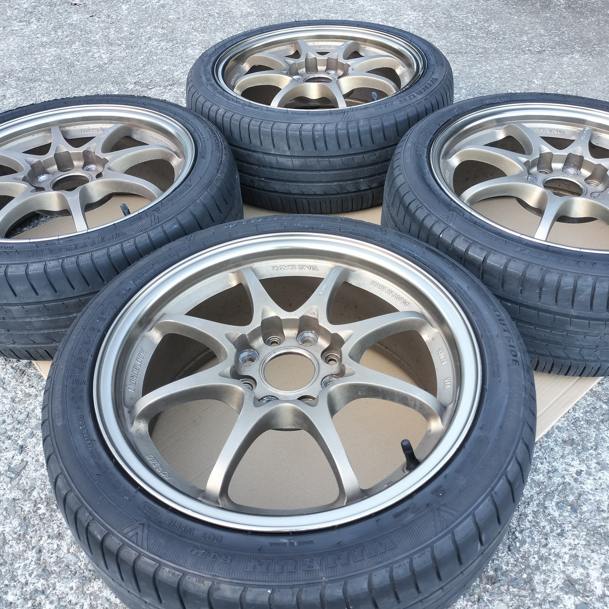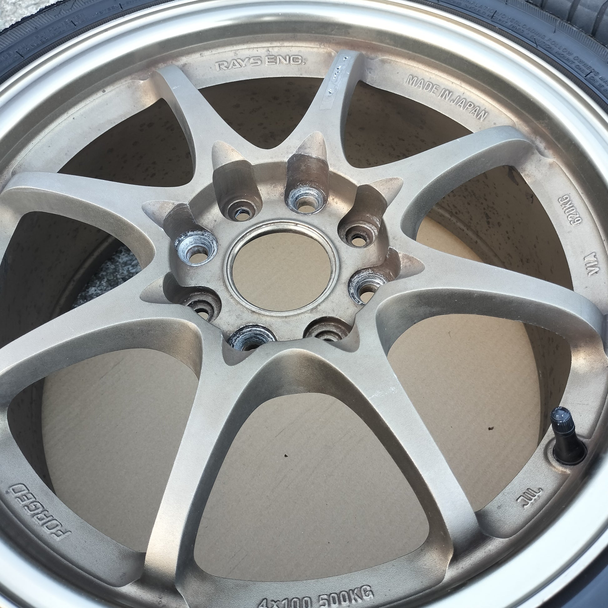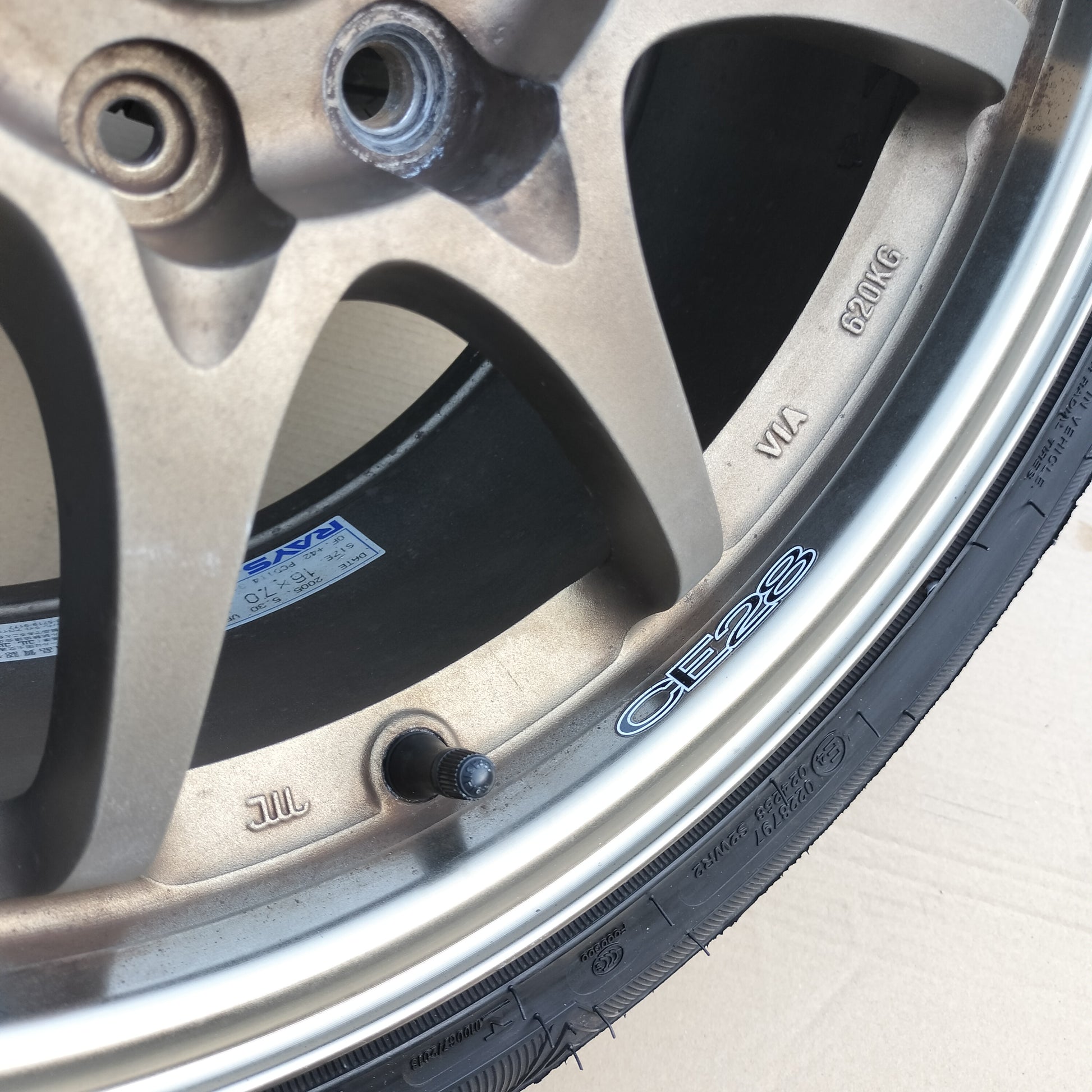 New black European valve stems (to replace the current generic rubber valve stems) and new black "VOLK RACING" "CE28" are included with the sale!