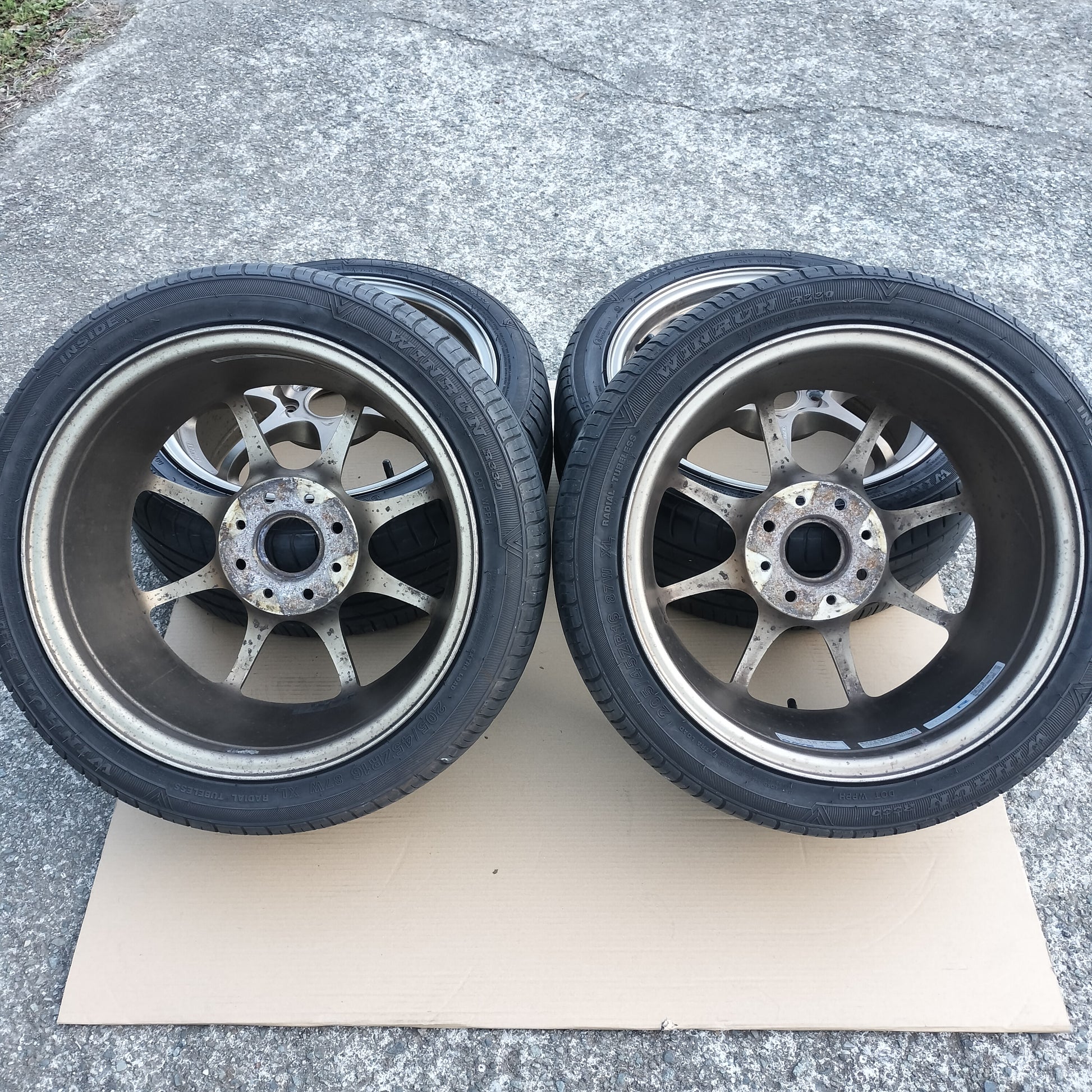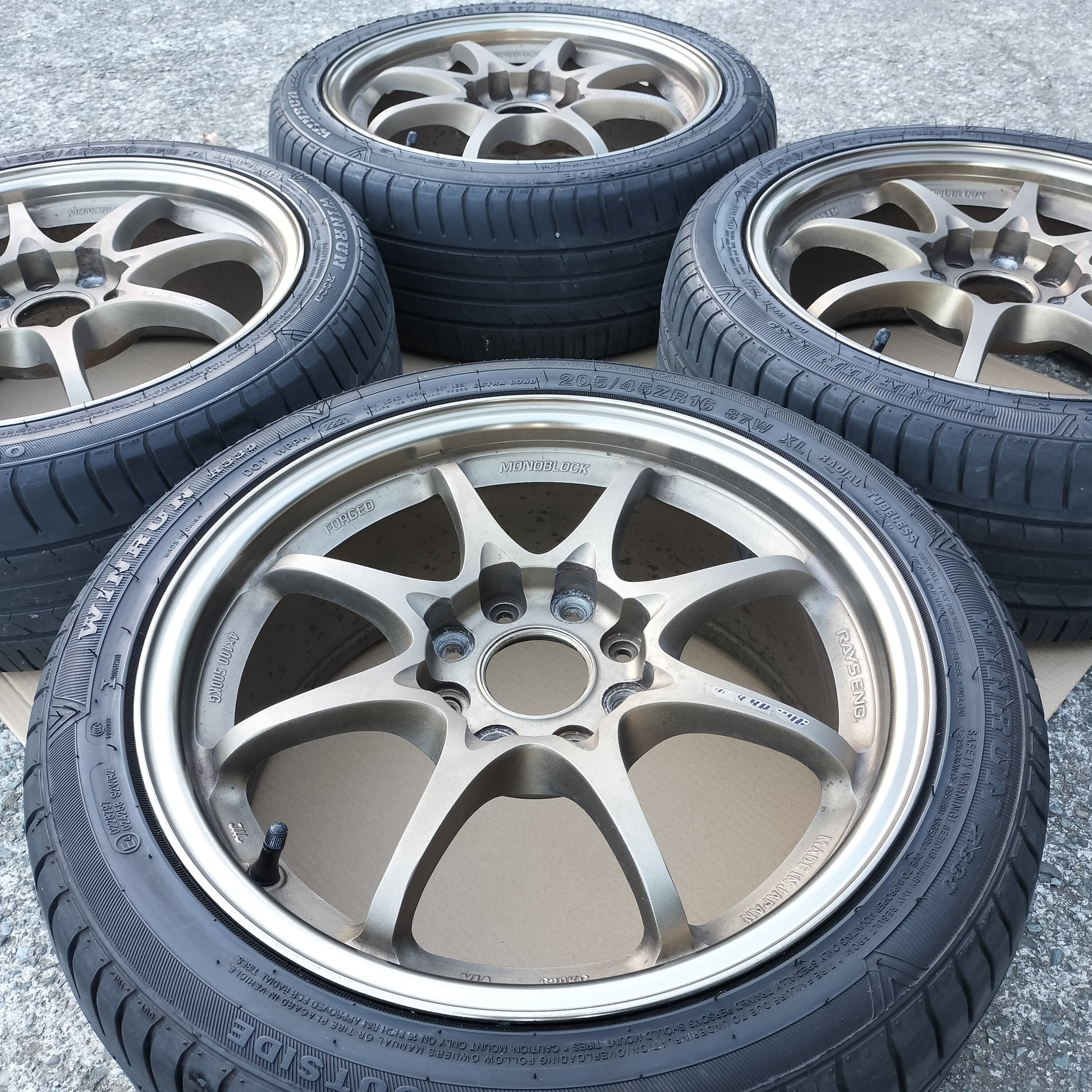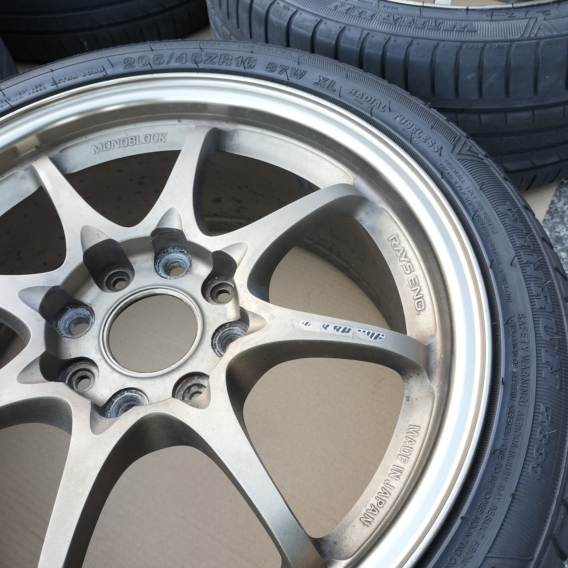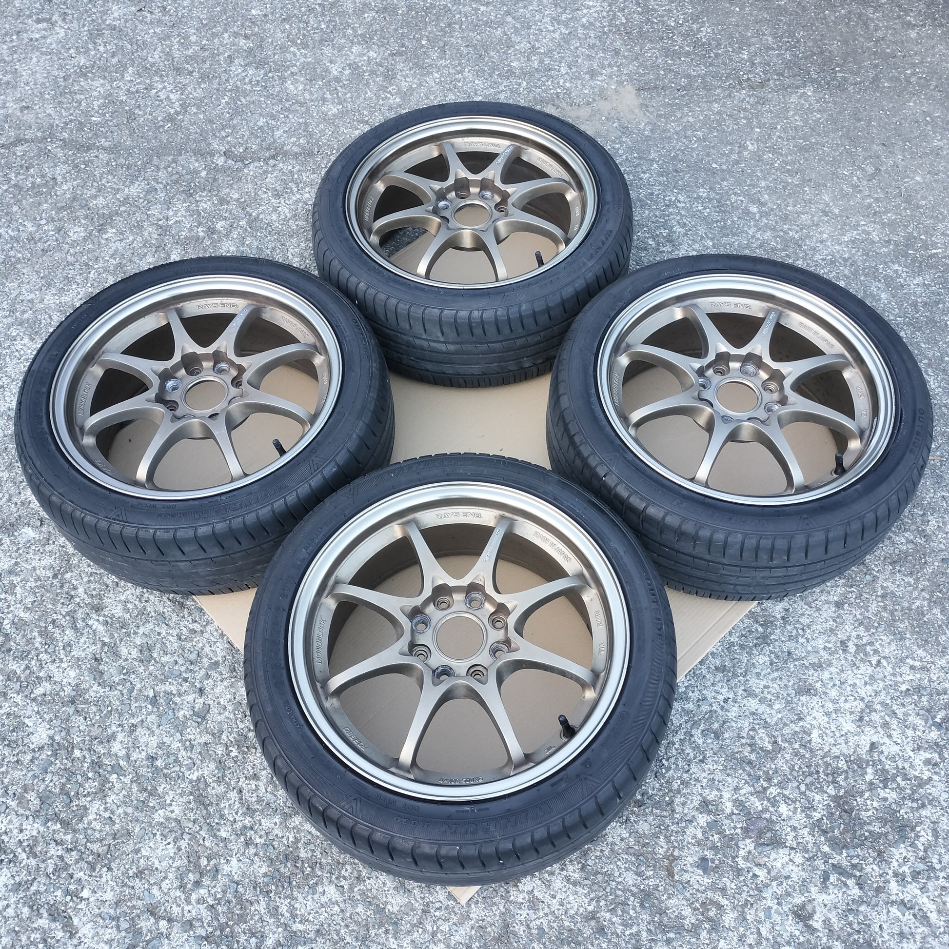 New black European valve stems (to replace the current generic rubber valve stems) and new black "VOLK RACING" "CE28" are included with the sale!