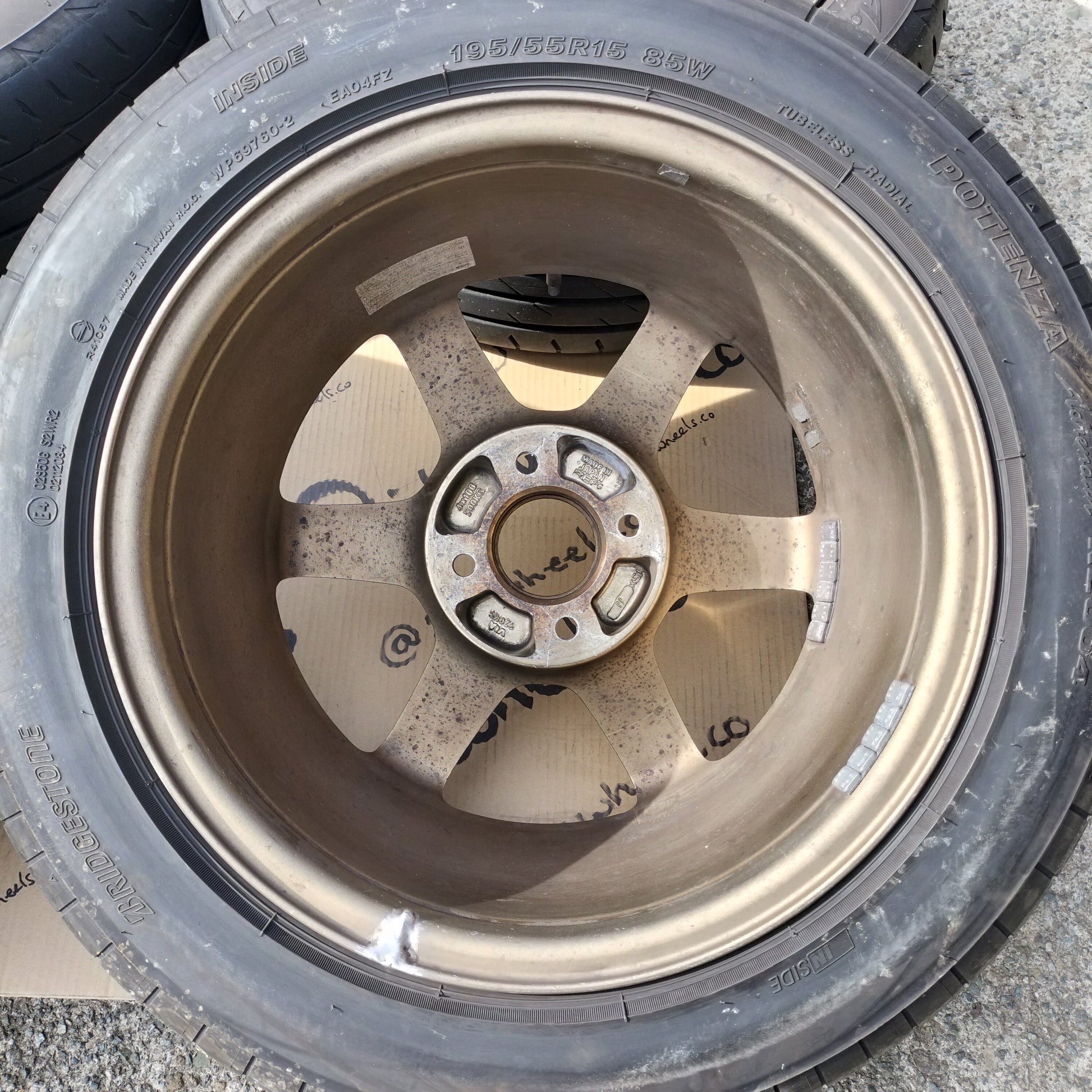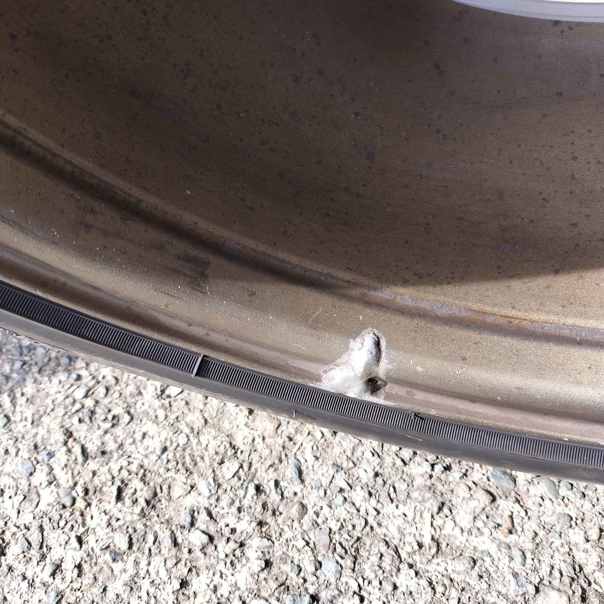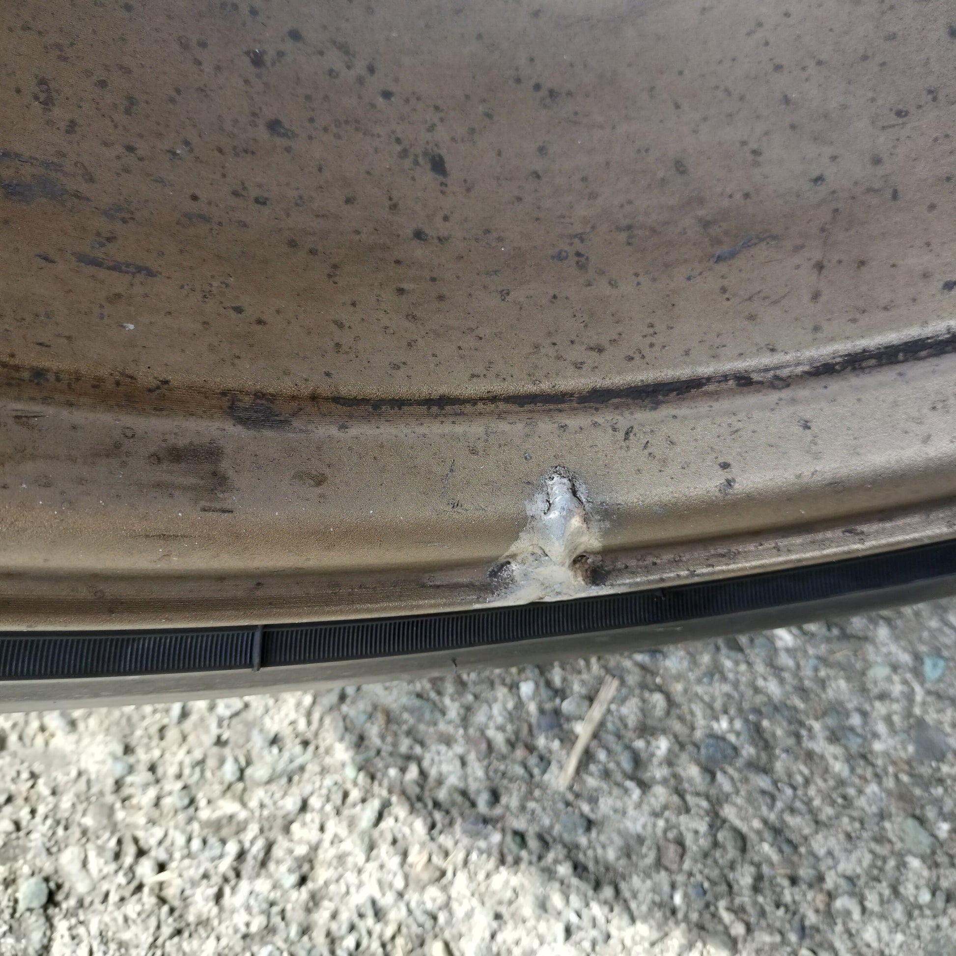 One wheel has a welded crack repair on the inner lip. The tire is mounted and holding air.