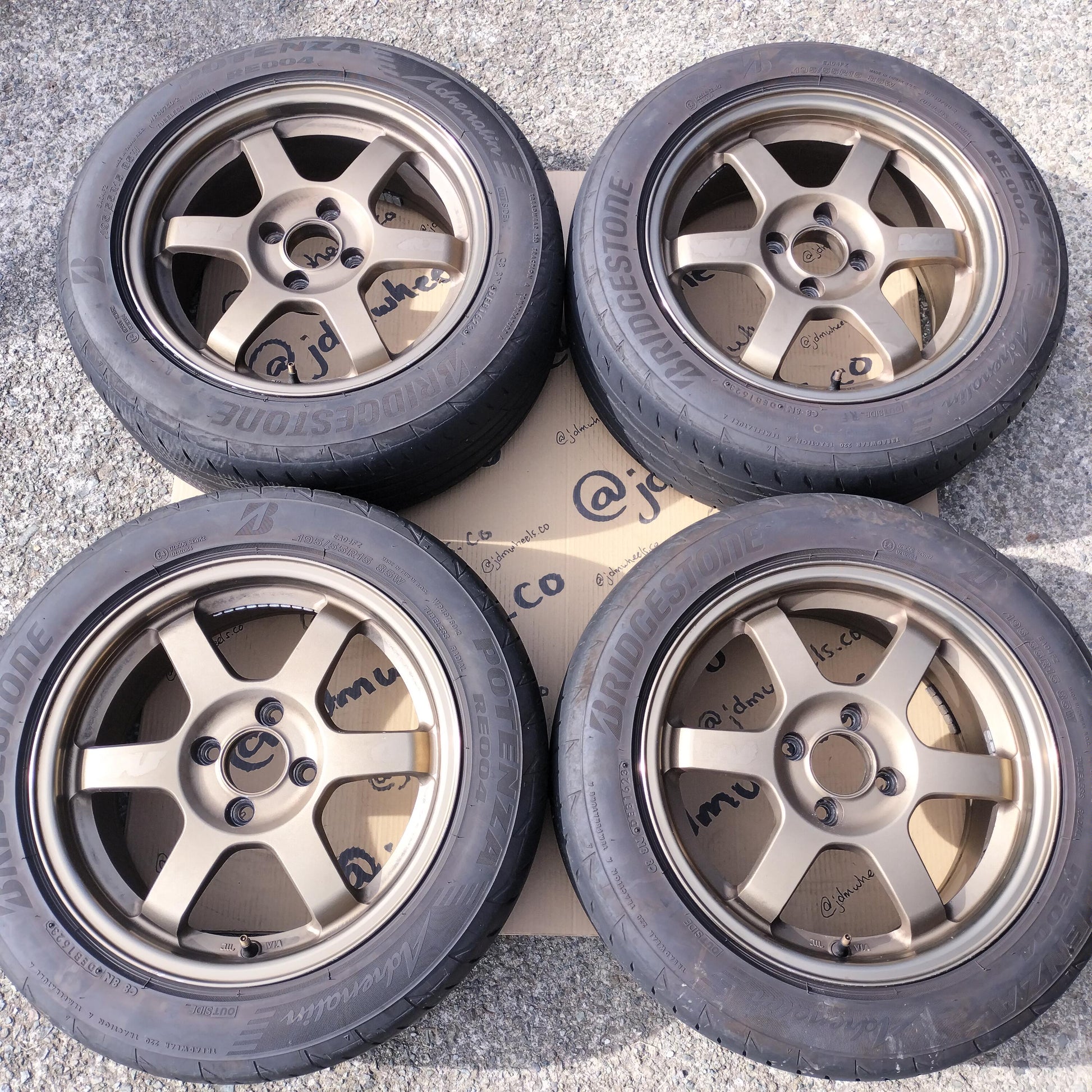I have new Rays black or blue valves stems (¥8,900/set of 4) and spoke stickers in stock (¥5,400/set of 4), if you'd like to combine shipping and freshen the wheels up. Please let me know if you'd like a set of both/either and which color after purchasing the wheels and I'll invoice you separately.