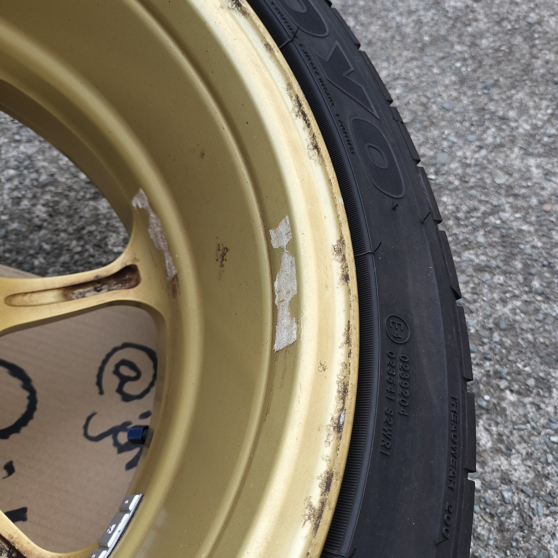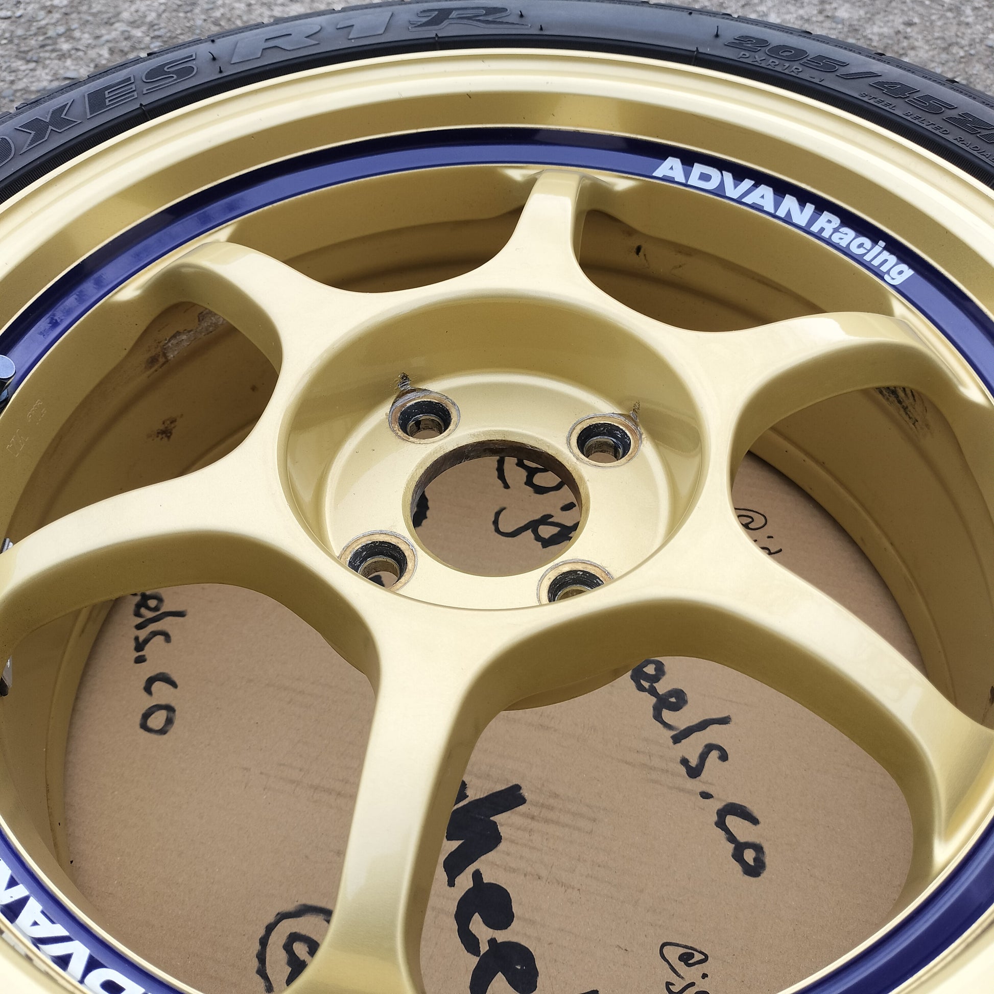 There are some small nicks and chips from normal use and the lug nut holes have some wear marks. (I have Advan RGII gold touch up paint I can use to touch up those spots if the buyer wishes - just let me know after purchase. The color match will be pretty close but not exact.)