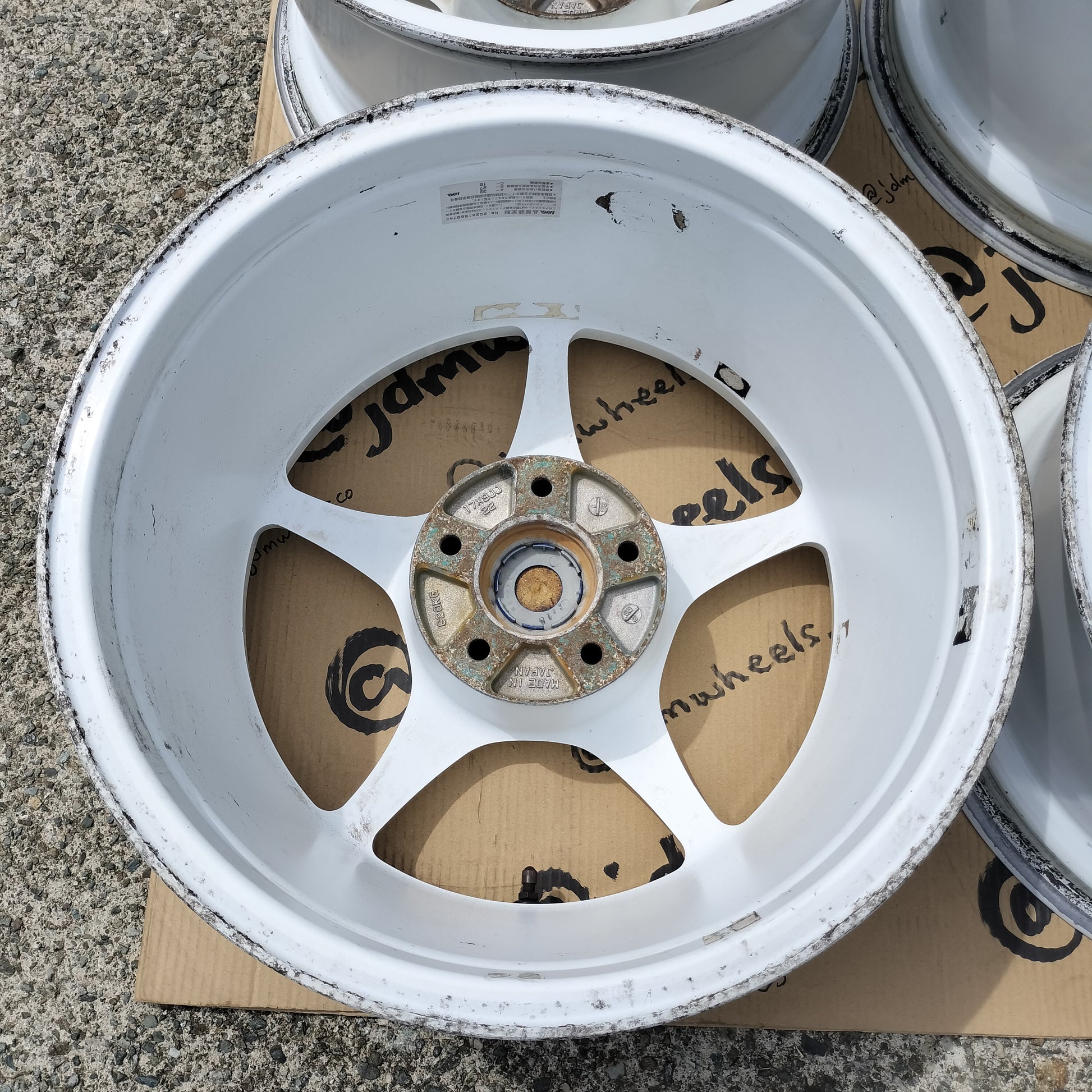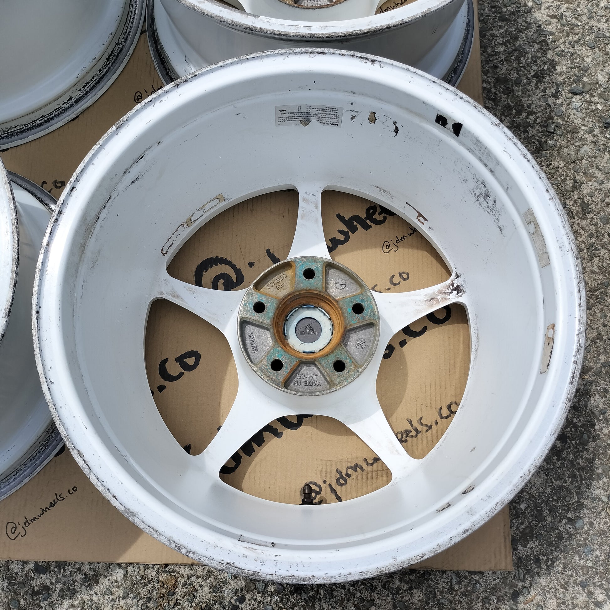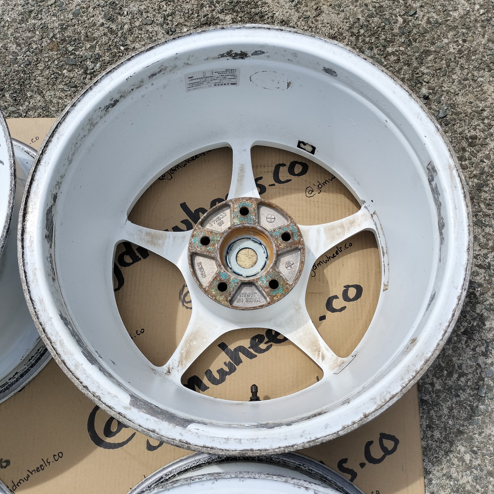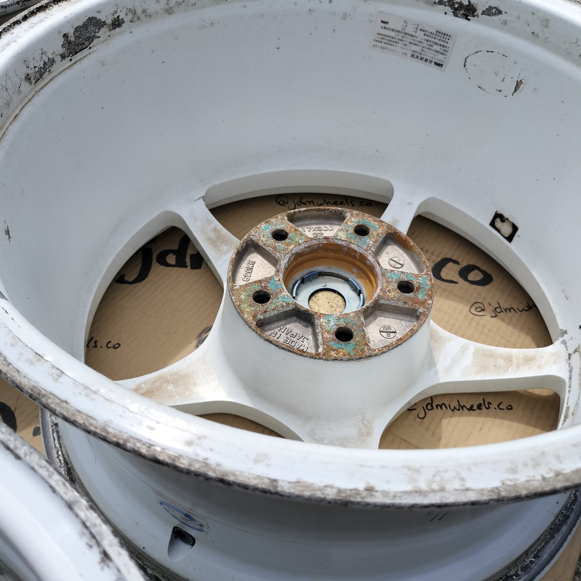 A very clean example of these early era classics in great s-chassis, RX-7, or BNR32 specs! A little fading in the finish, nicks and chips, and some heavy flaking on the inside of one but no heavy rash. Center caps included as well. Great condition to enjoy as is or refinish with minimal work needed. Gotta love the super deep mounting hub on these!
