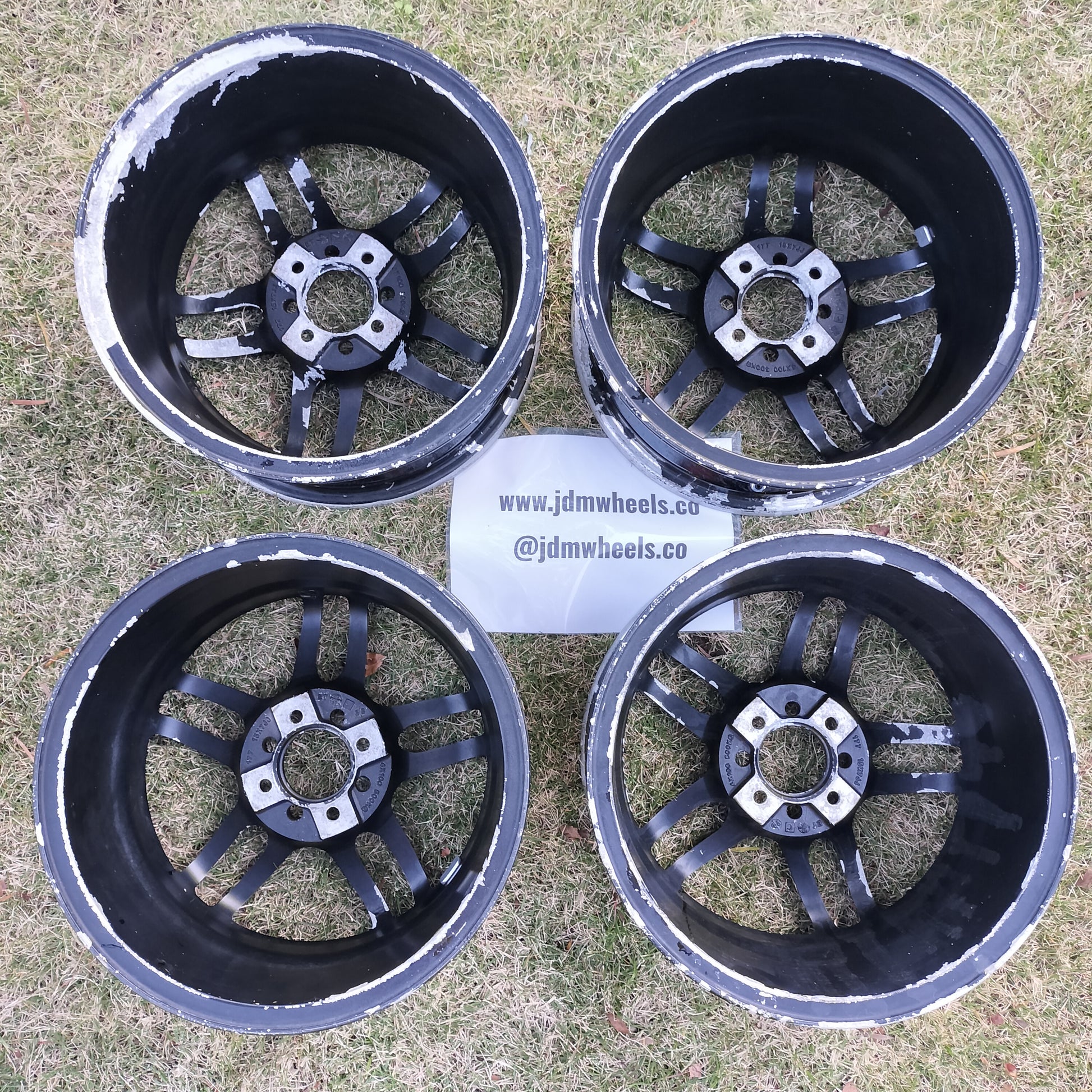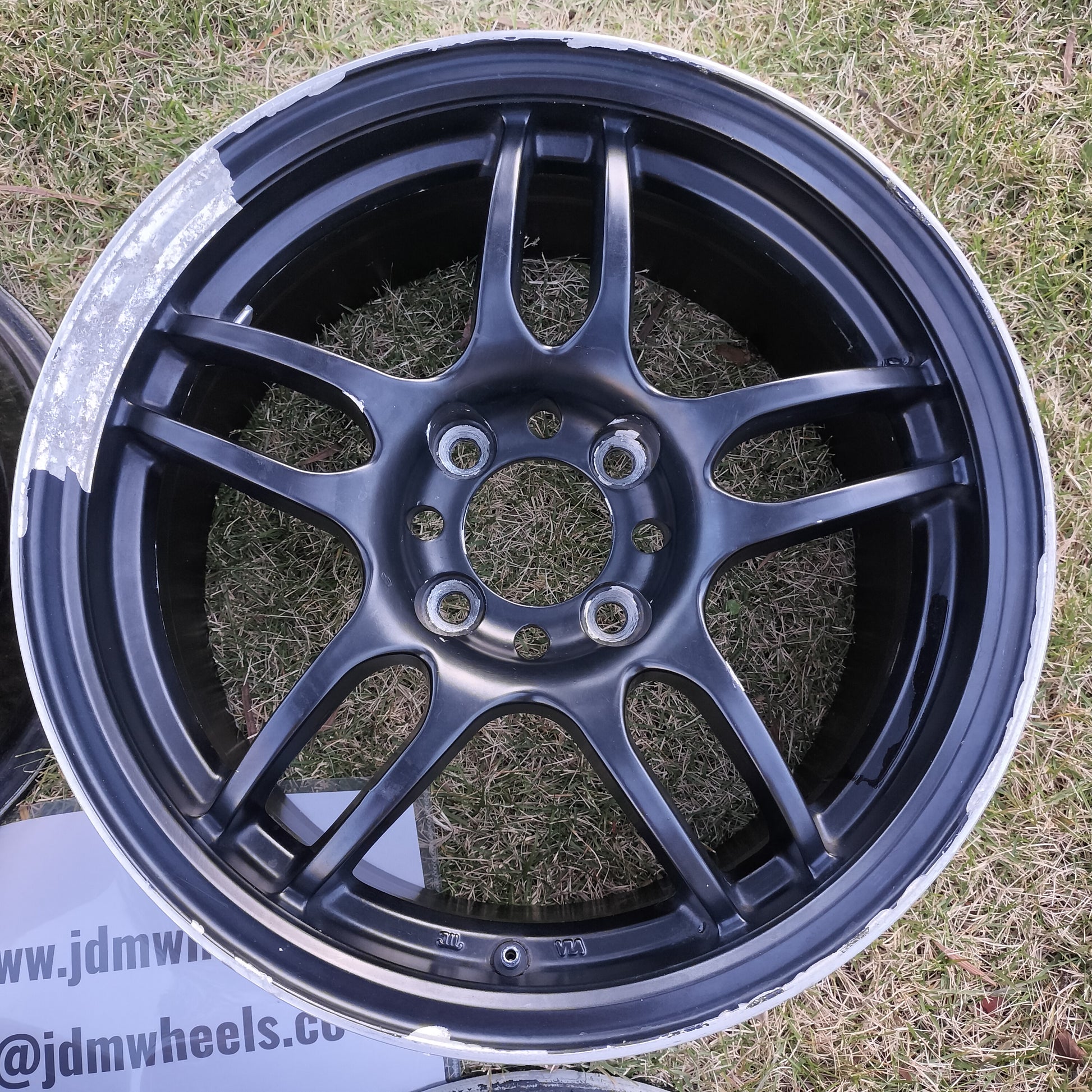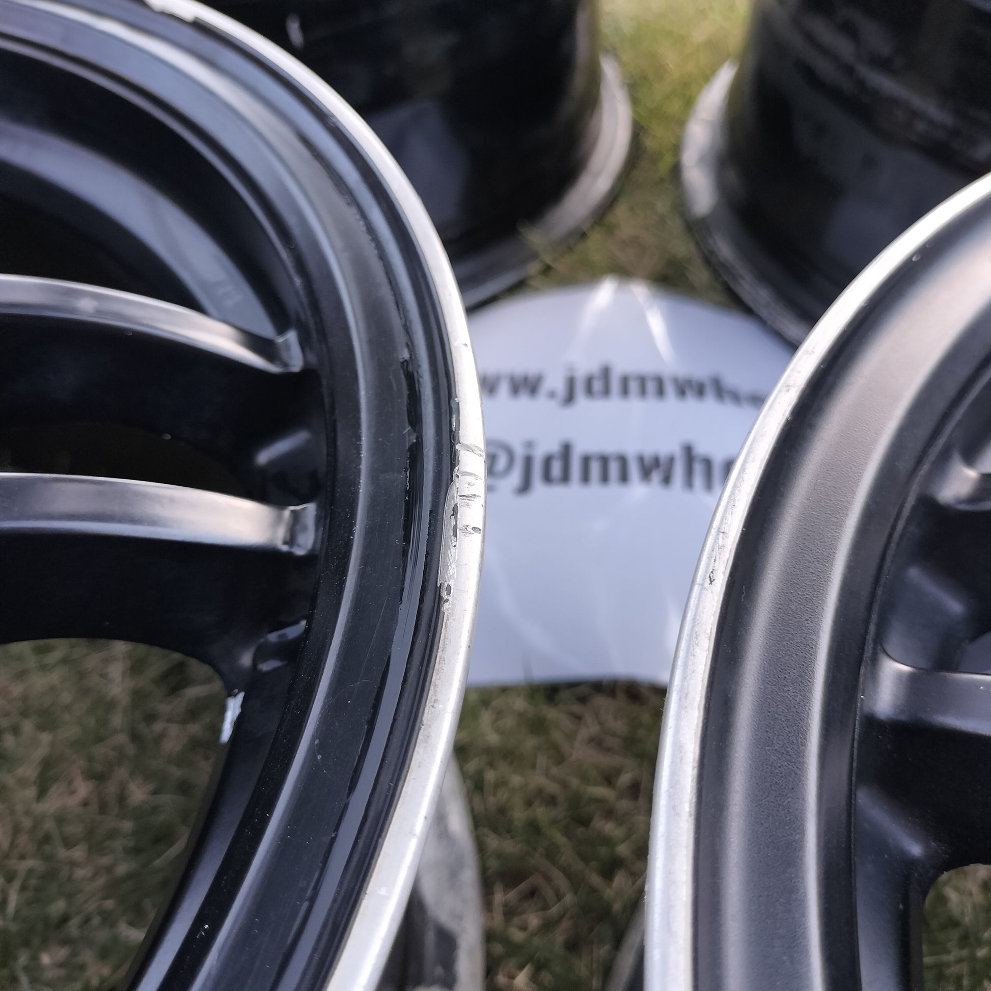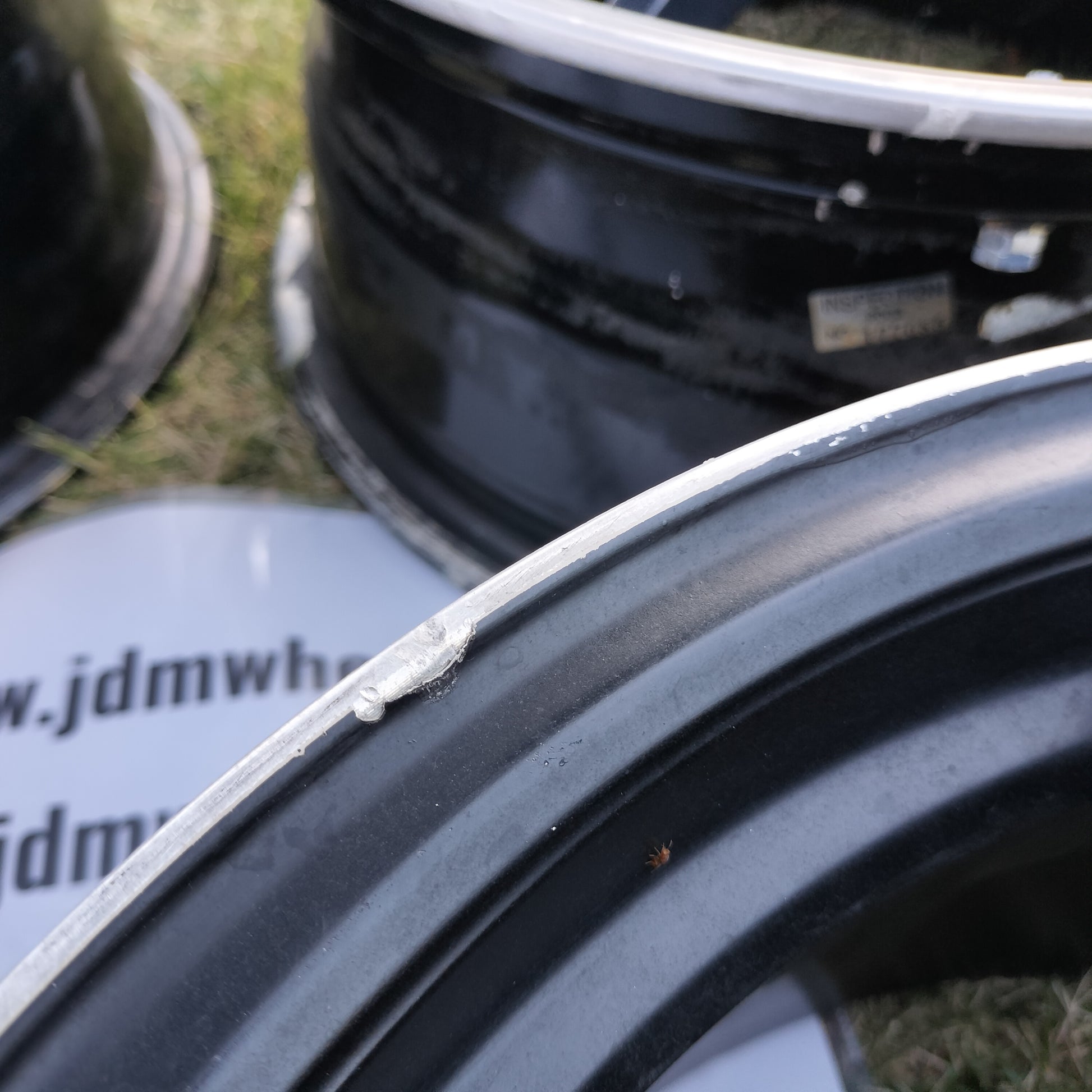 The black finish is flaking heavily on these. No major rash, but it does look like one spot has been sanded out a bit. I thought I noticed a small distortion on an outer lip but I couldn't find it again when taking pictures. Pretty cool "baby R33 GT-R wheels"! Great condition for a DIY refinish.