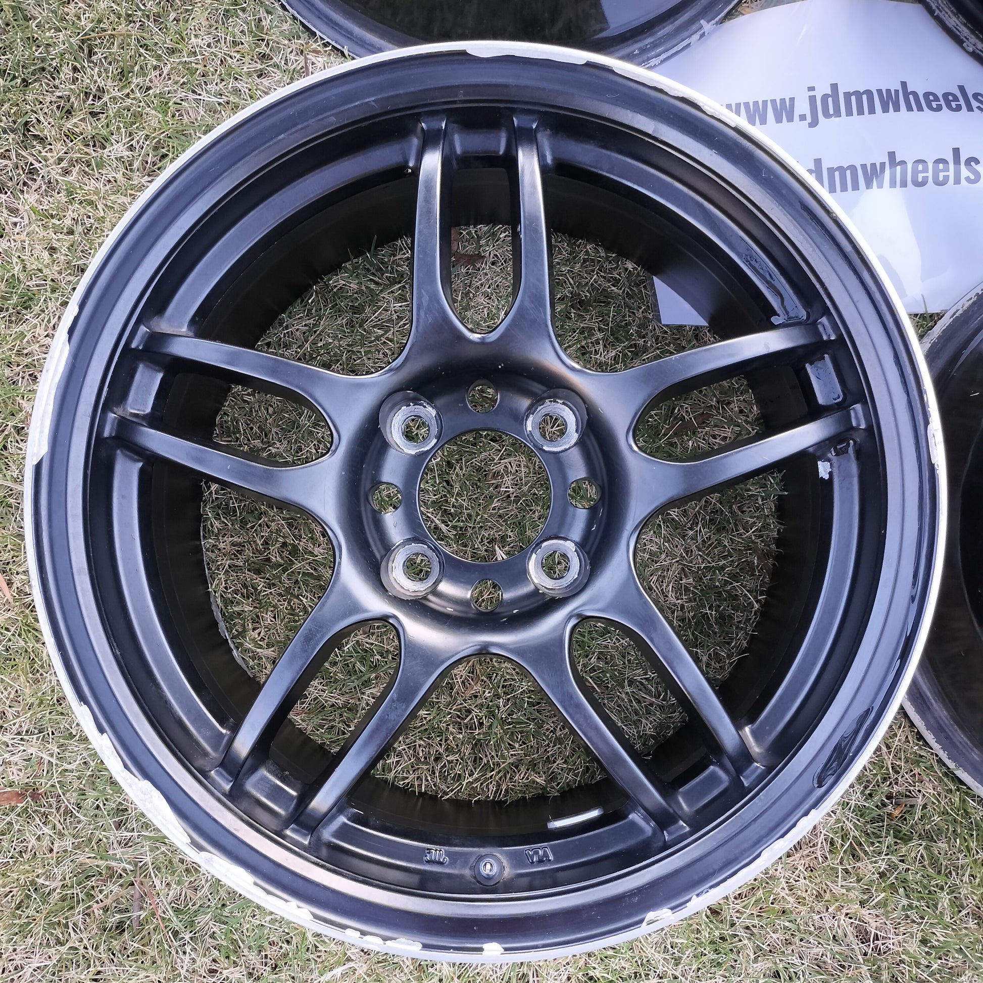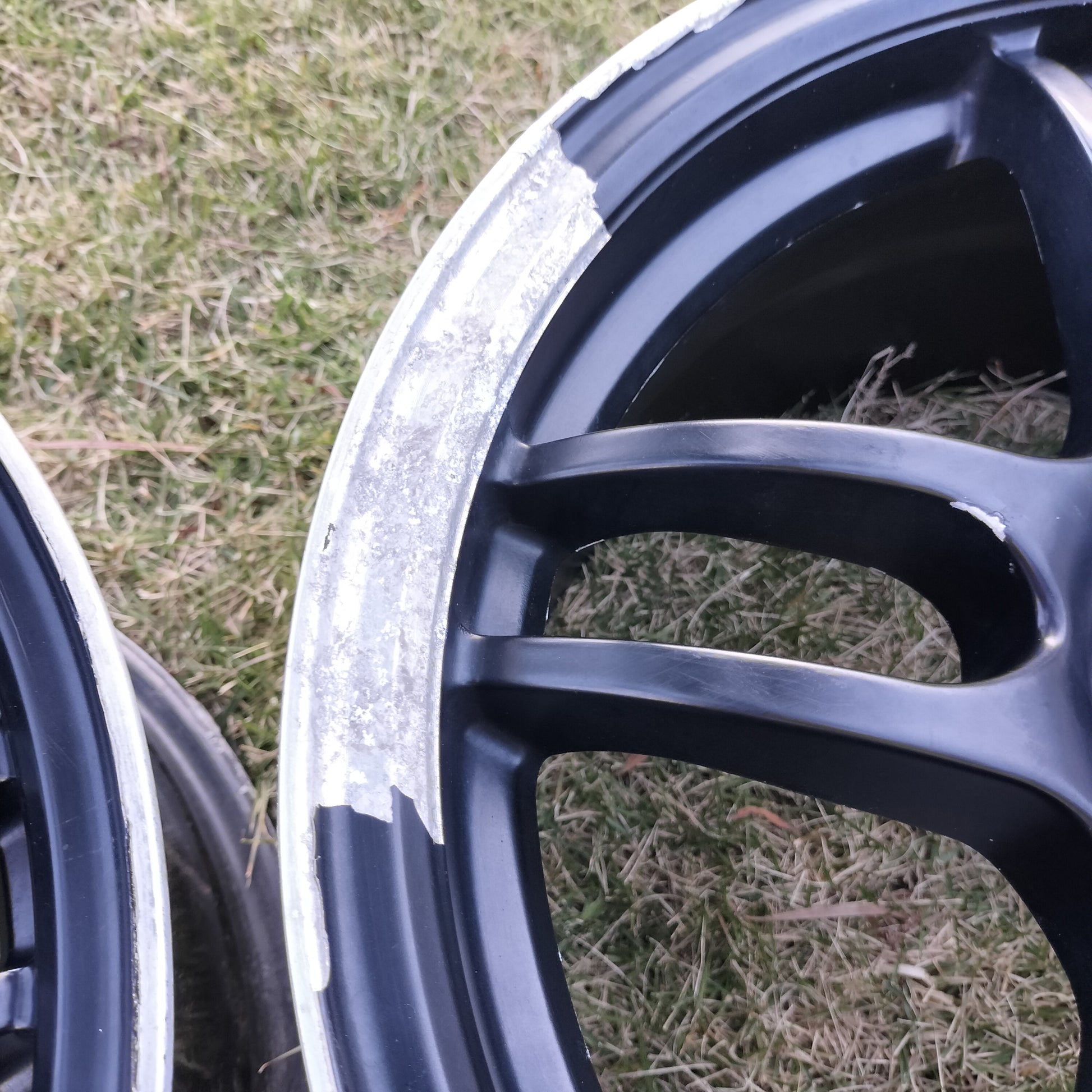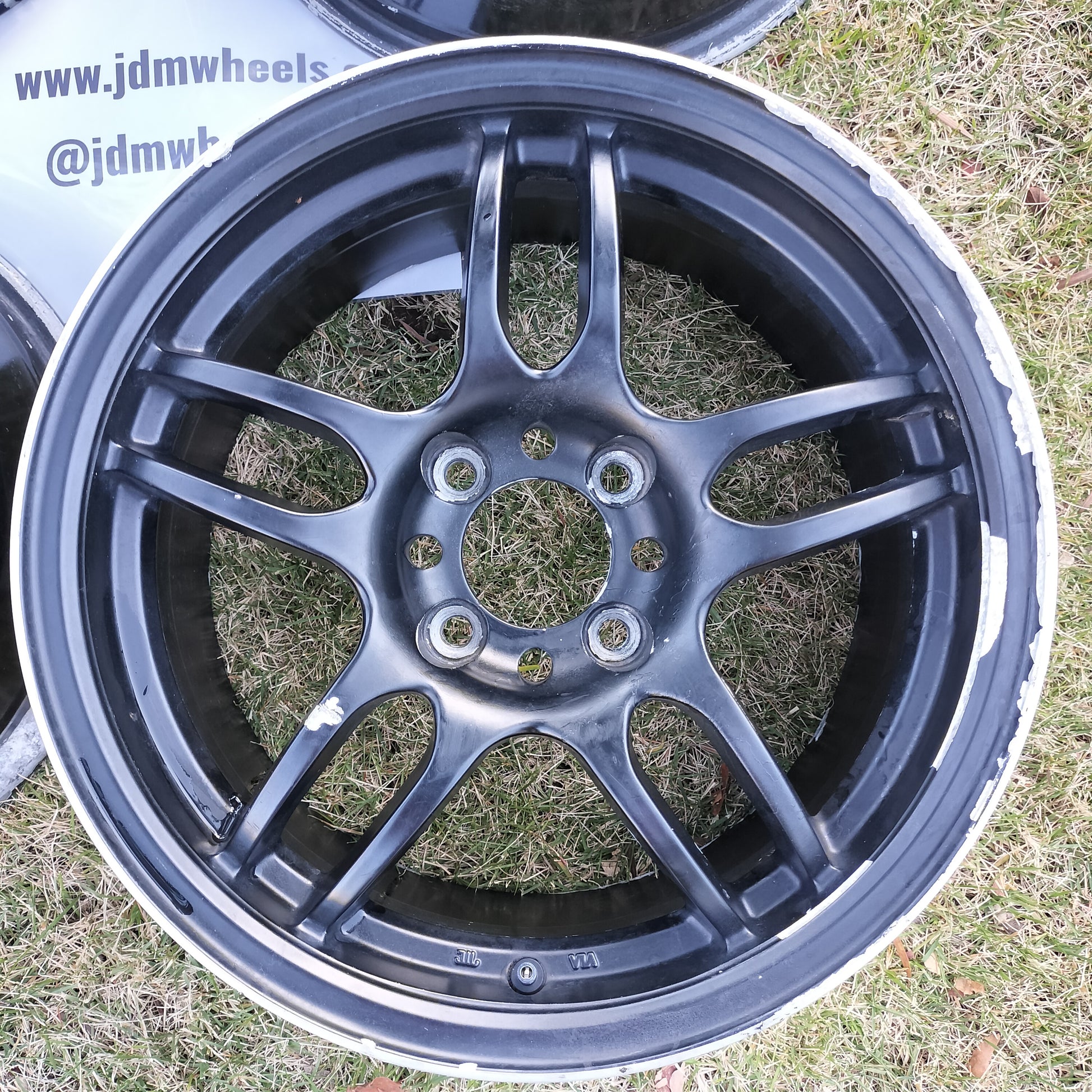 The black finish is flaking heavily on these. No major rash, but it does look like one spot has been sanded out a bit. I thought I noticed a small distortion on an outer lip but I couldn't find it again when taking pictures. Pretty cool "baby R33 GT-R wheels"! Great condition for a DIY refinish.
