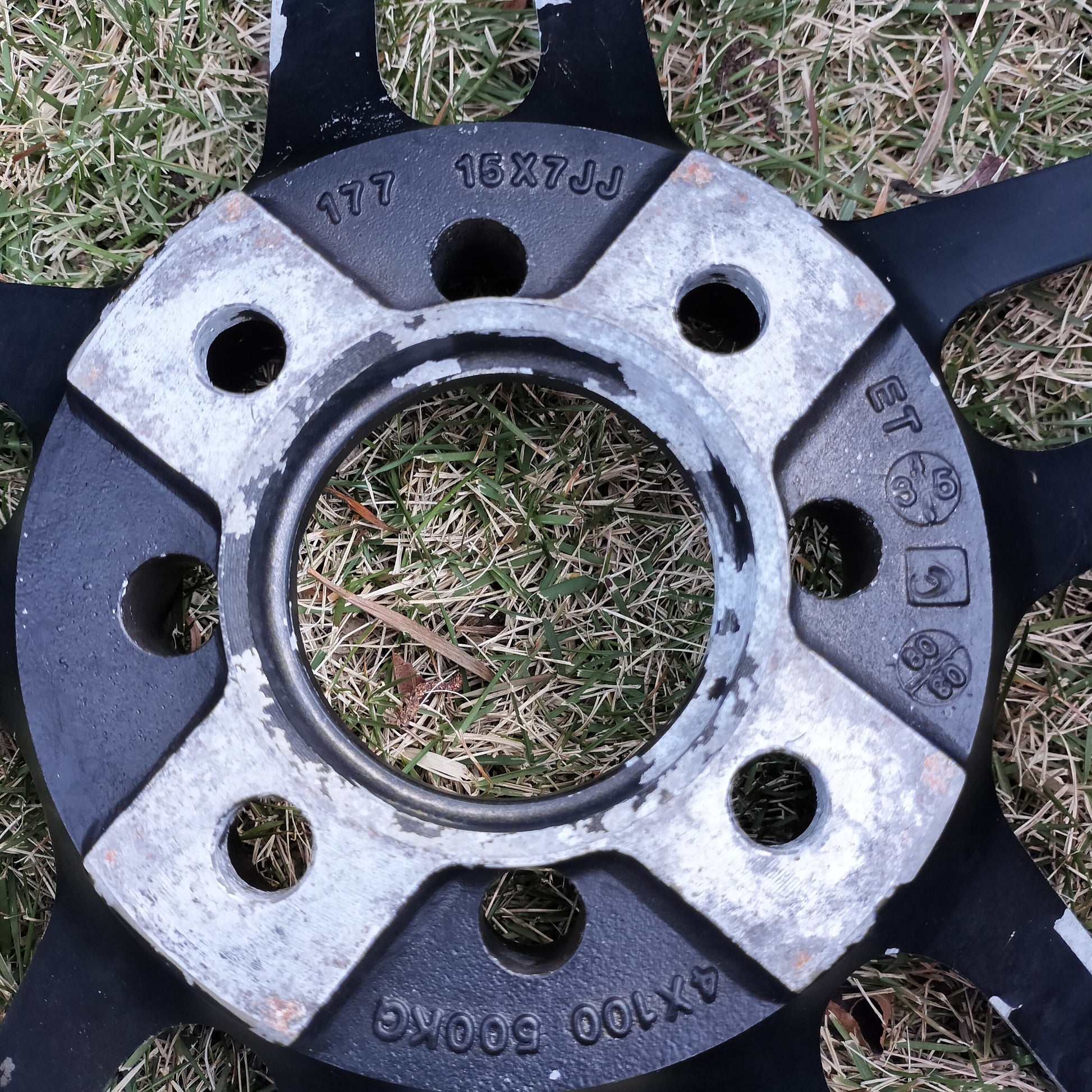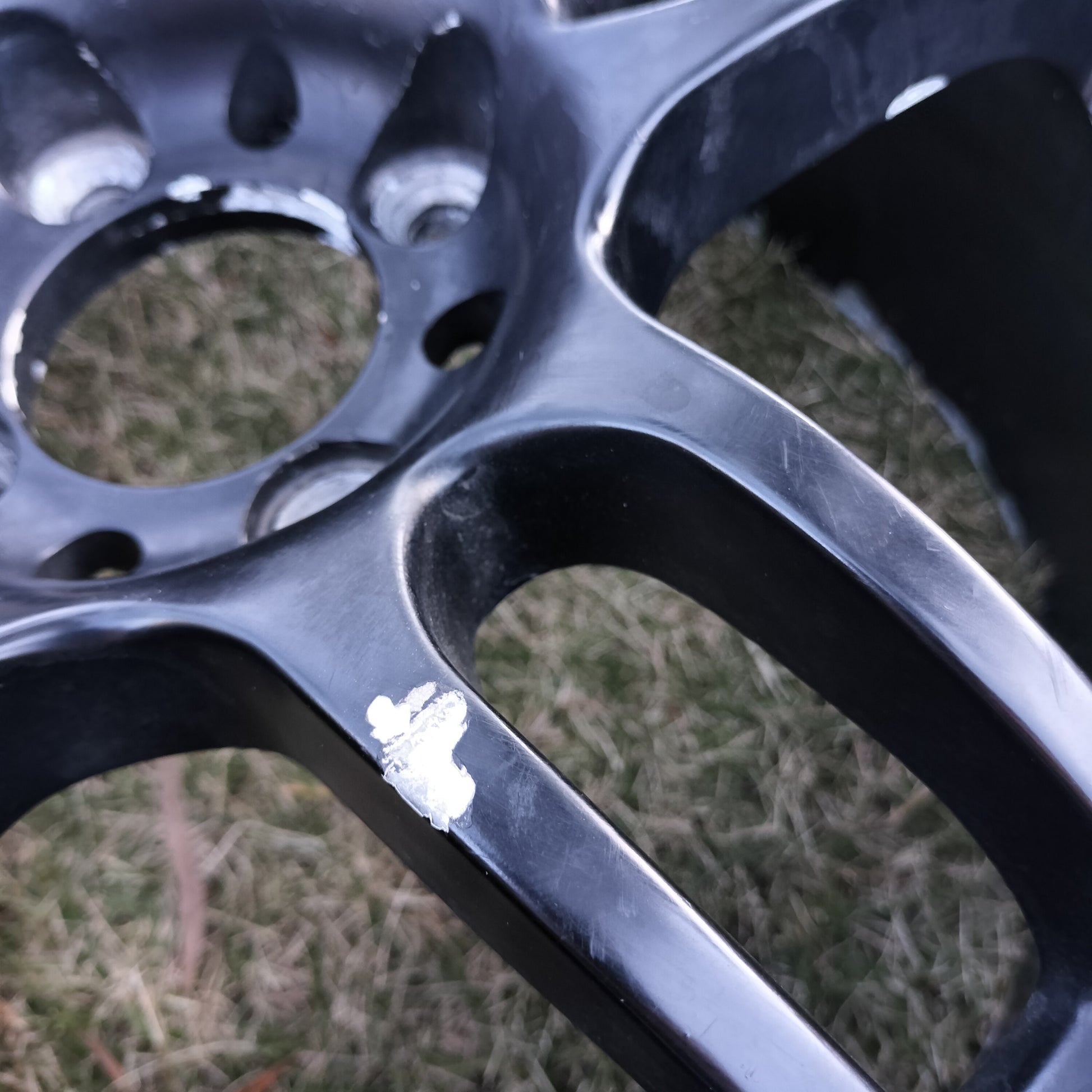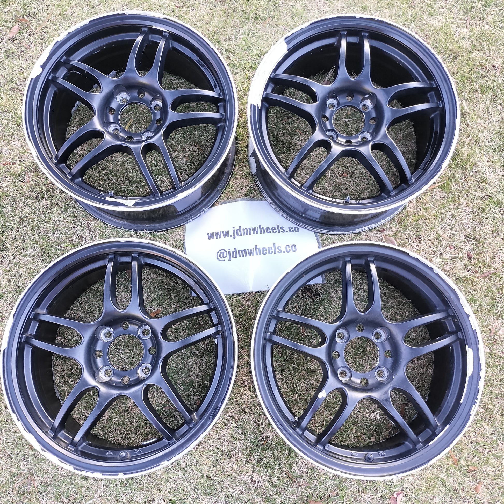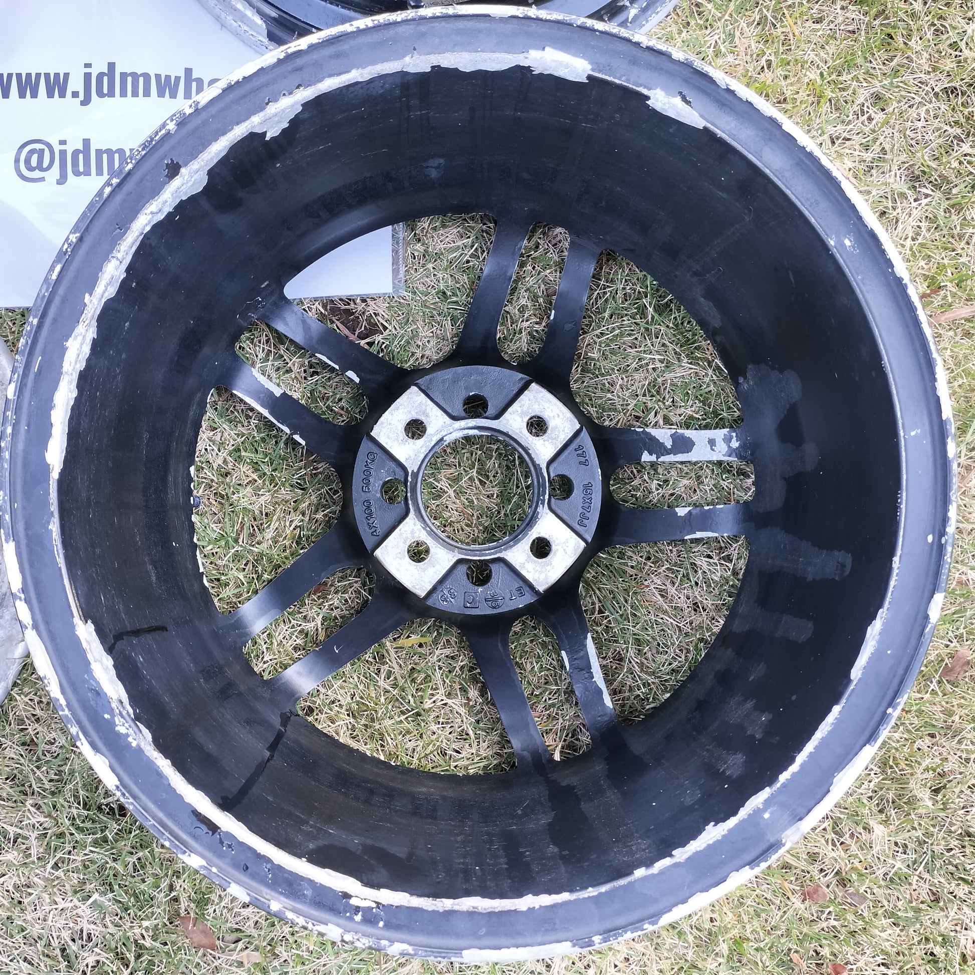 The black finish is flaking heavily on these. No major rash, but it does look like one spot has been sanded out a bit. I thought I noticed a small distortion on an outer lip but I couldn't find it again when taking pictures. Pretty cool "baby R33 GT-R wheels"! Great condition for a DIY refinish.