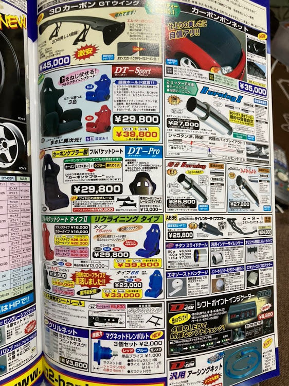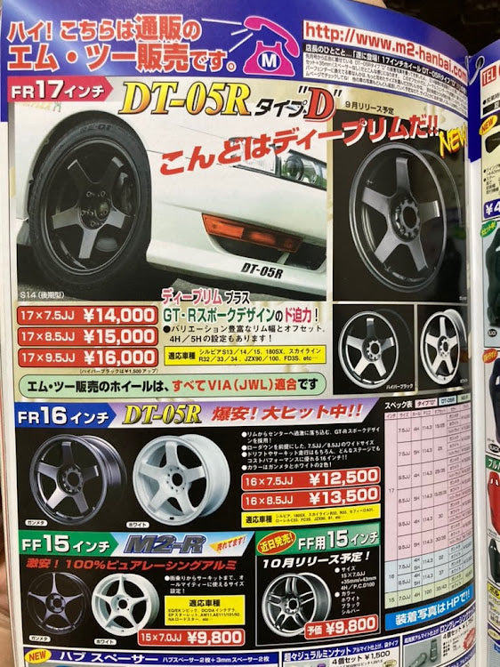 M2 Hanbai was a parts company in Japan that faded out some years ago. They made a bit of everything - wheels, seats, brake pads, etc. Their more popular and well known wheel is the DT-05R which has an aggressive five spoke pattern. This is the first set of these I've seen! Refer to old advertisement image when they were just releasing this wheel.