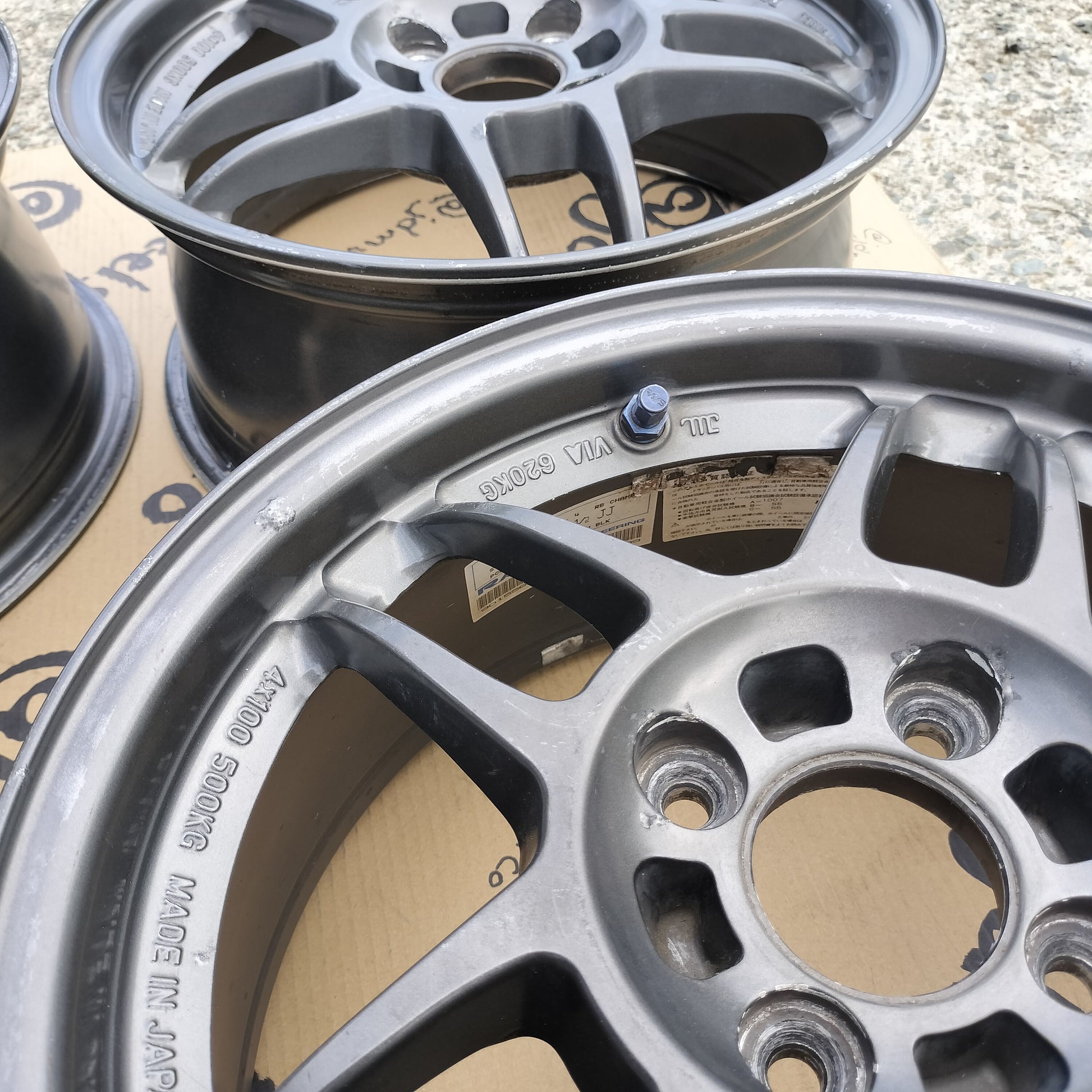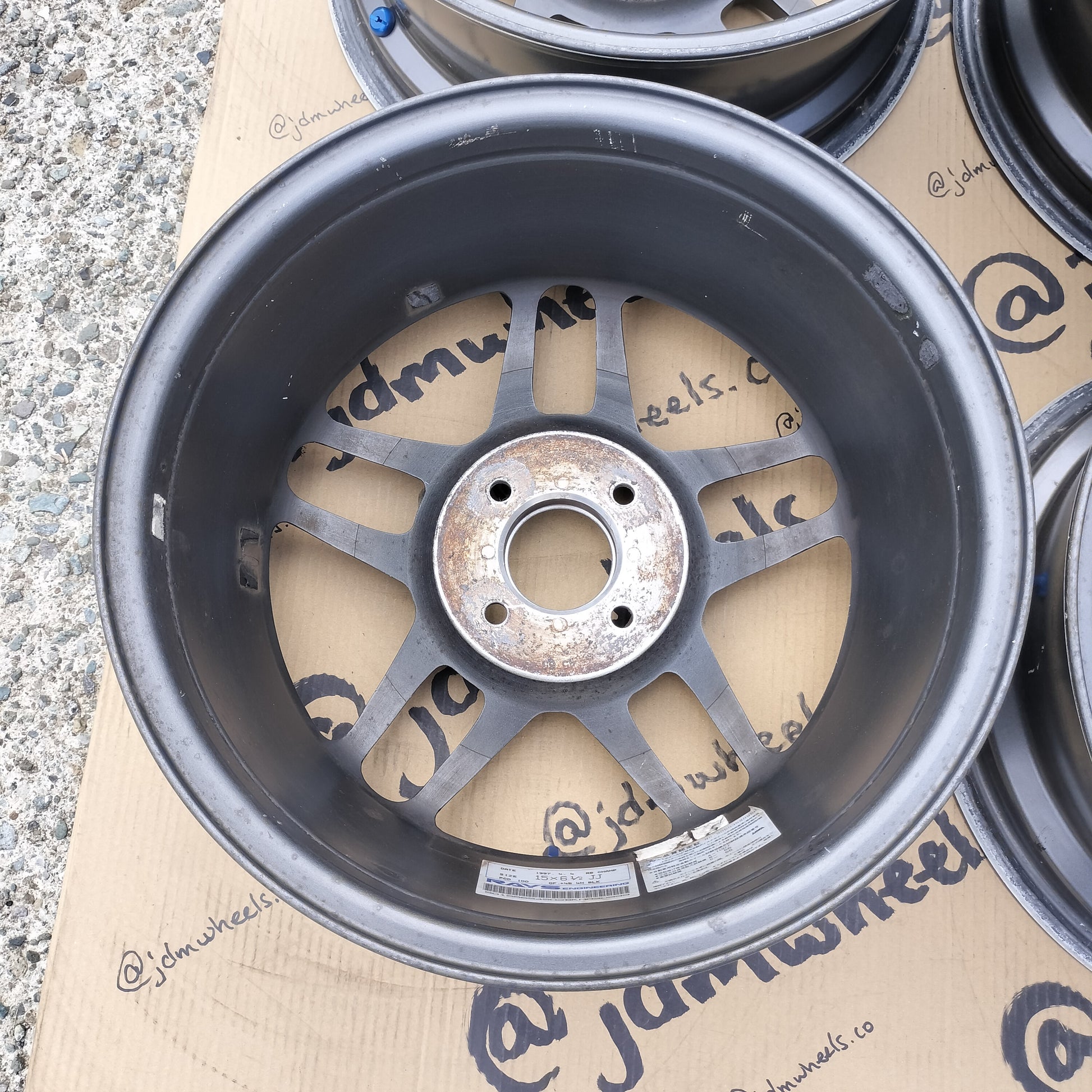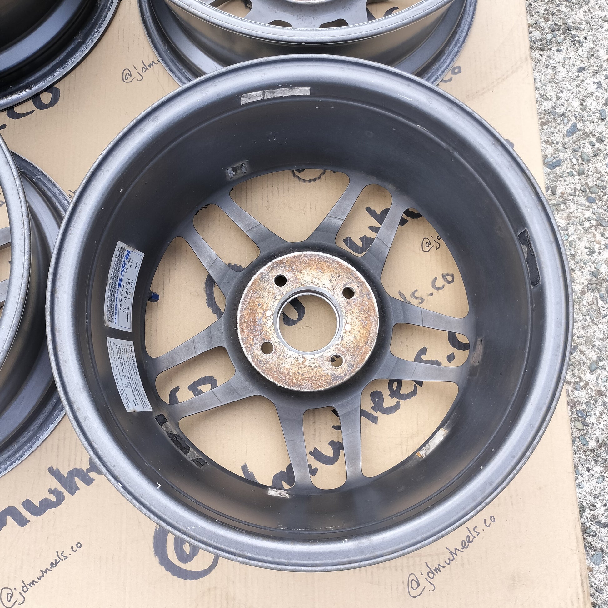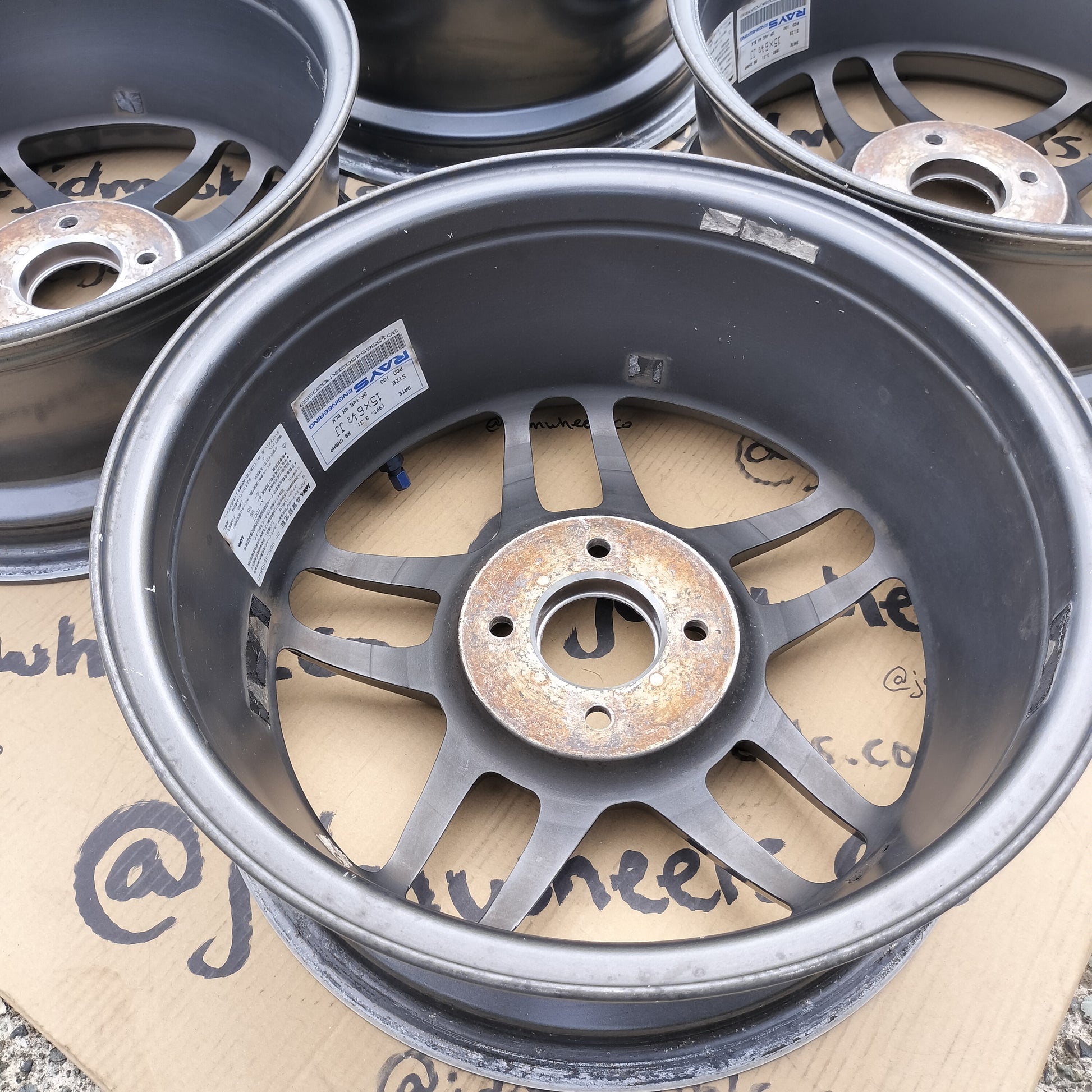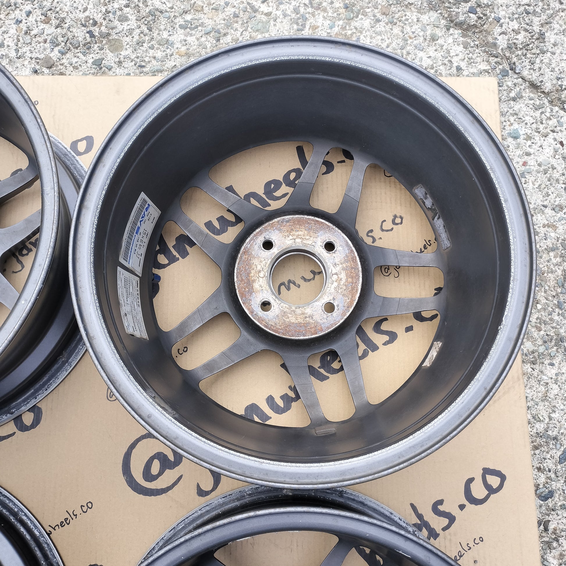 A blast from the past here - made in 1997! Forged construction. They have nicks, scratches, some rubs, and some discoloration. Originally black as indicated by the sticker but they'ved faded other the years and are now a gunmetal-ish grey. Most notable is the bubbling and failing finish. They'd need refinished to be perfect but they could be ran an is if you're not worried about it. Really neat split five spoke design with the pockets around the lug holes.