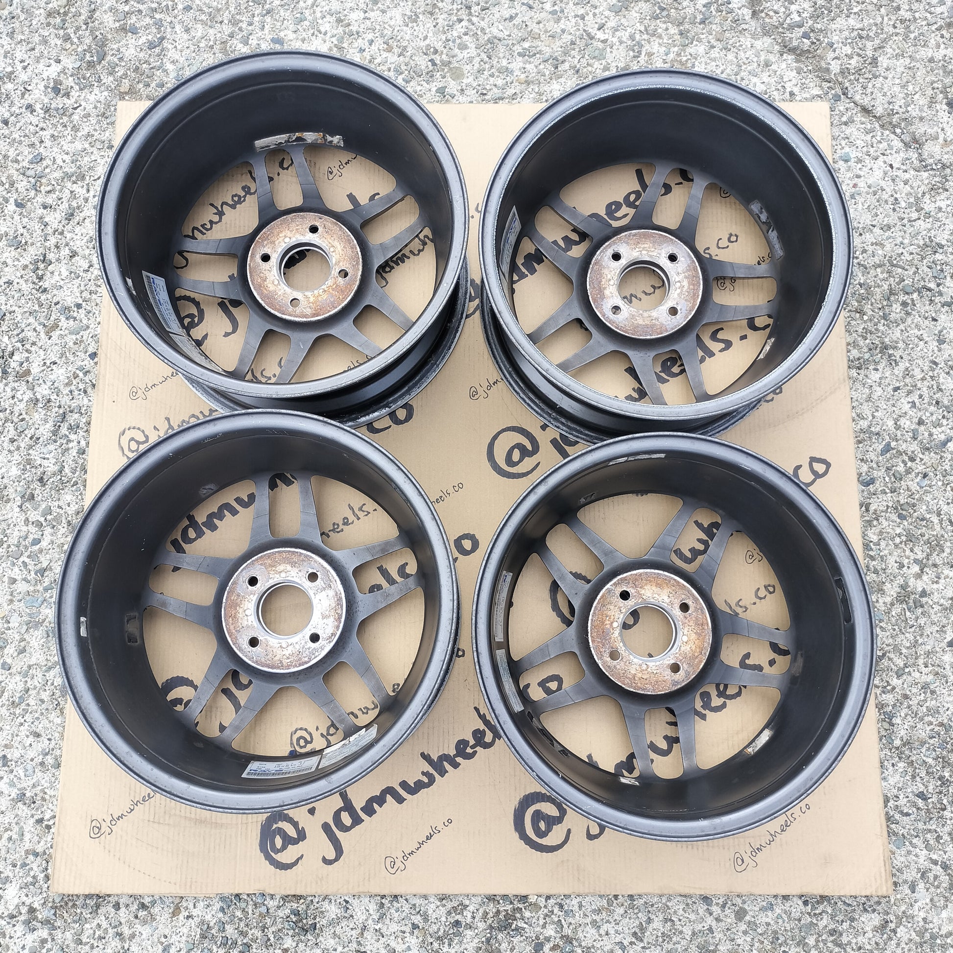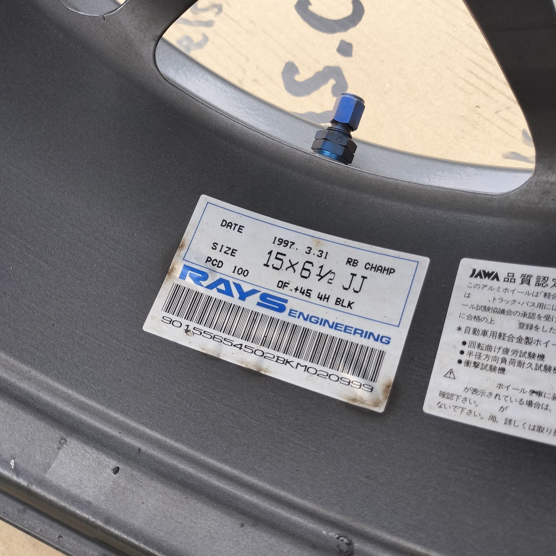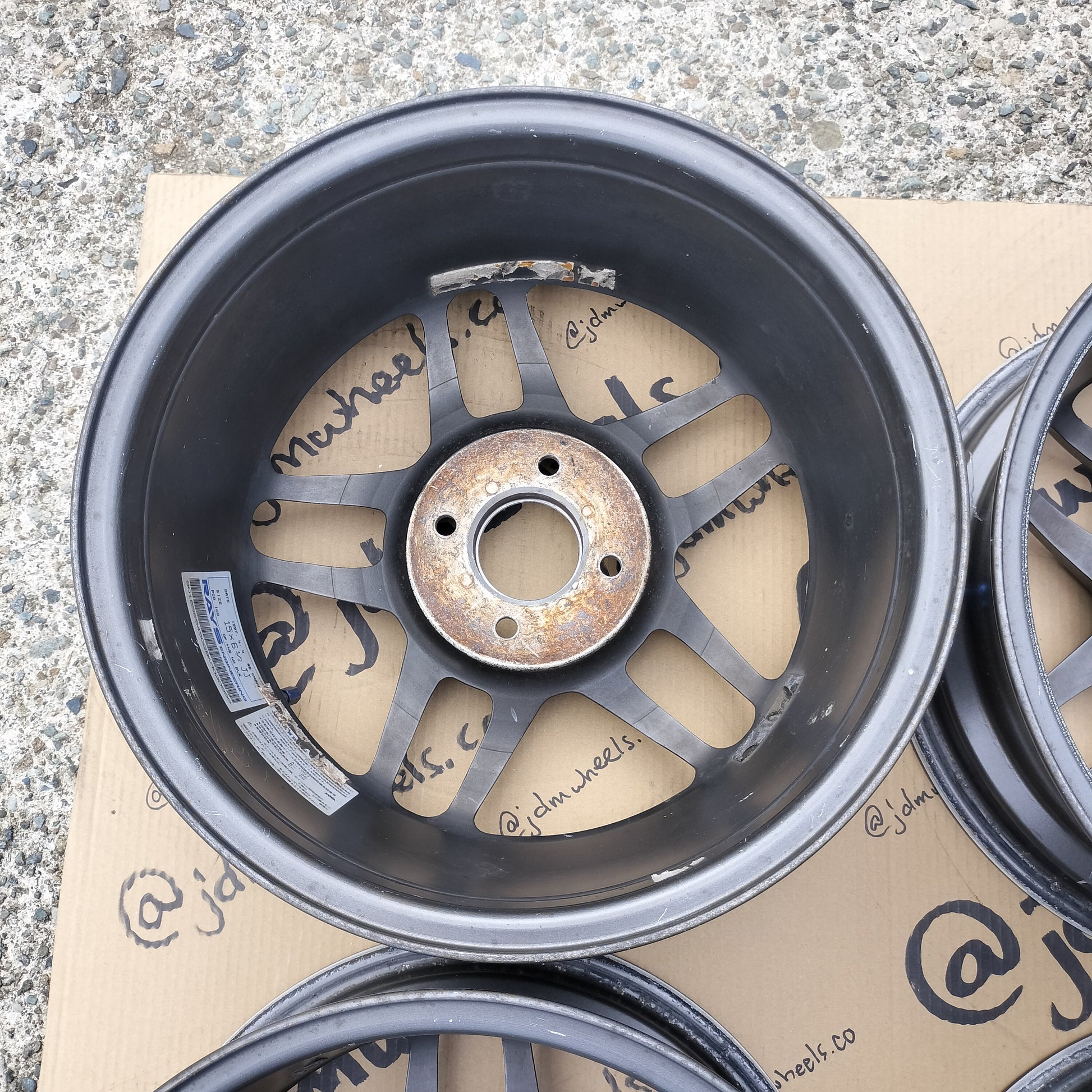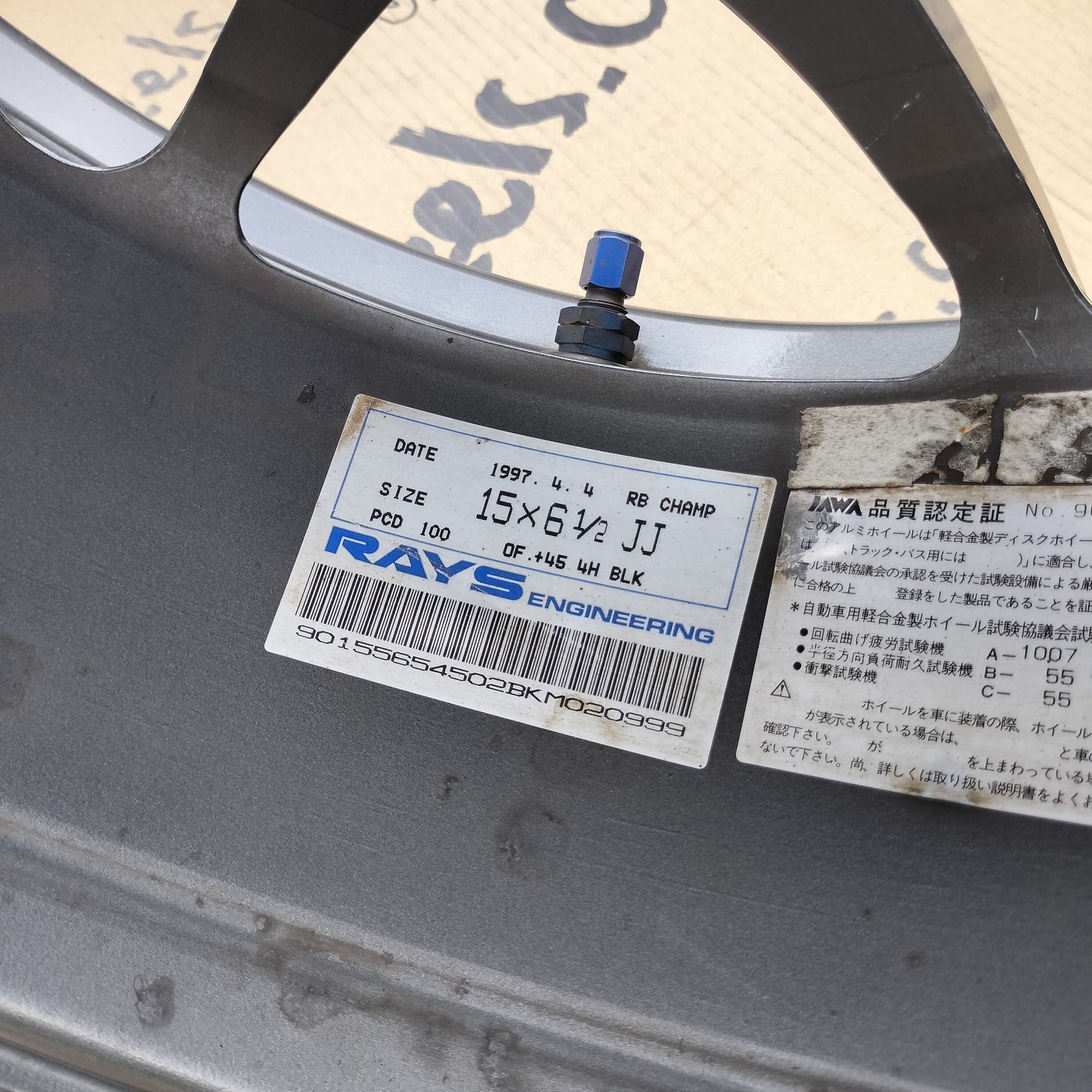 A blast from the past here - made in 1997! Forged construction. They have nicks, scratches, some rubs, and some discoloration. Originally black as indicated by the sticker but they'ved faded other the years and are now a gunmetal-ish grey. Most notable is the bubbling and failing finish. They'd need refinished to be perfect but they could be ran an is if you're not worried about it. Really neat split five spoke design with the pockets around the lug holes.