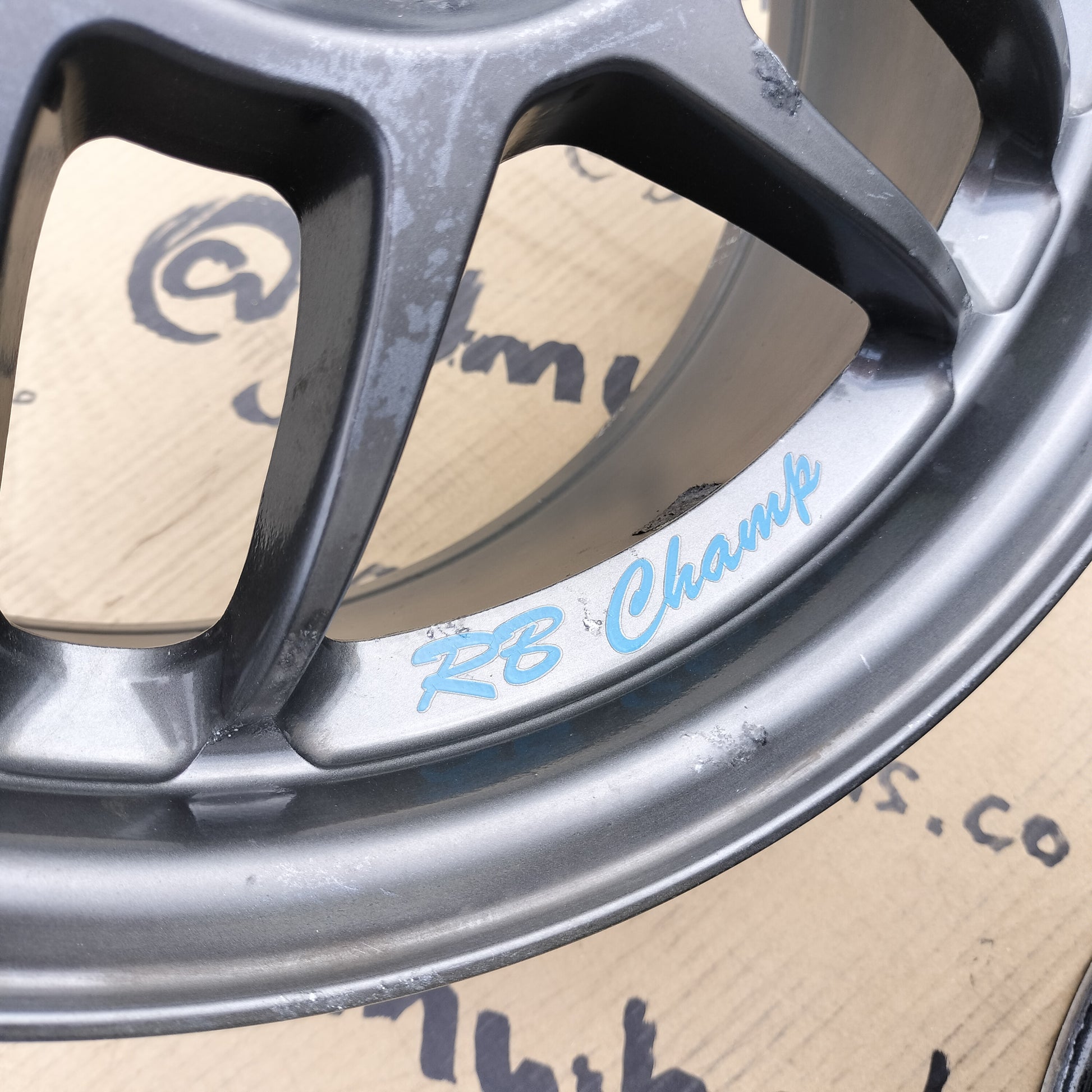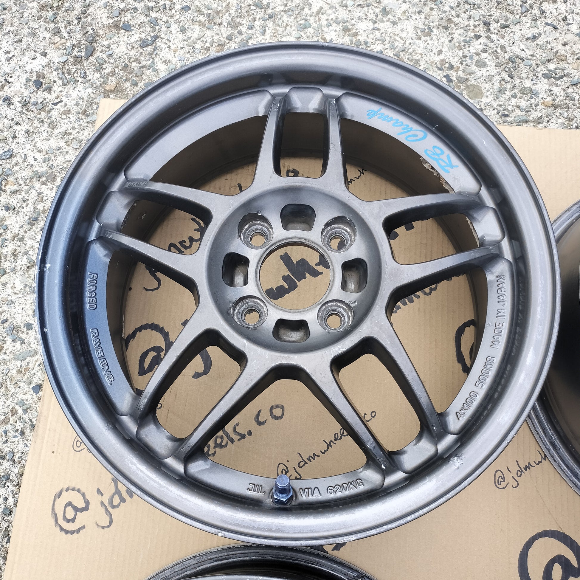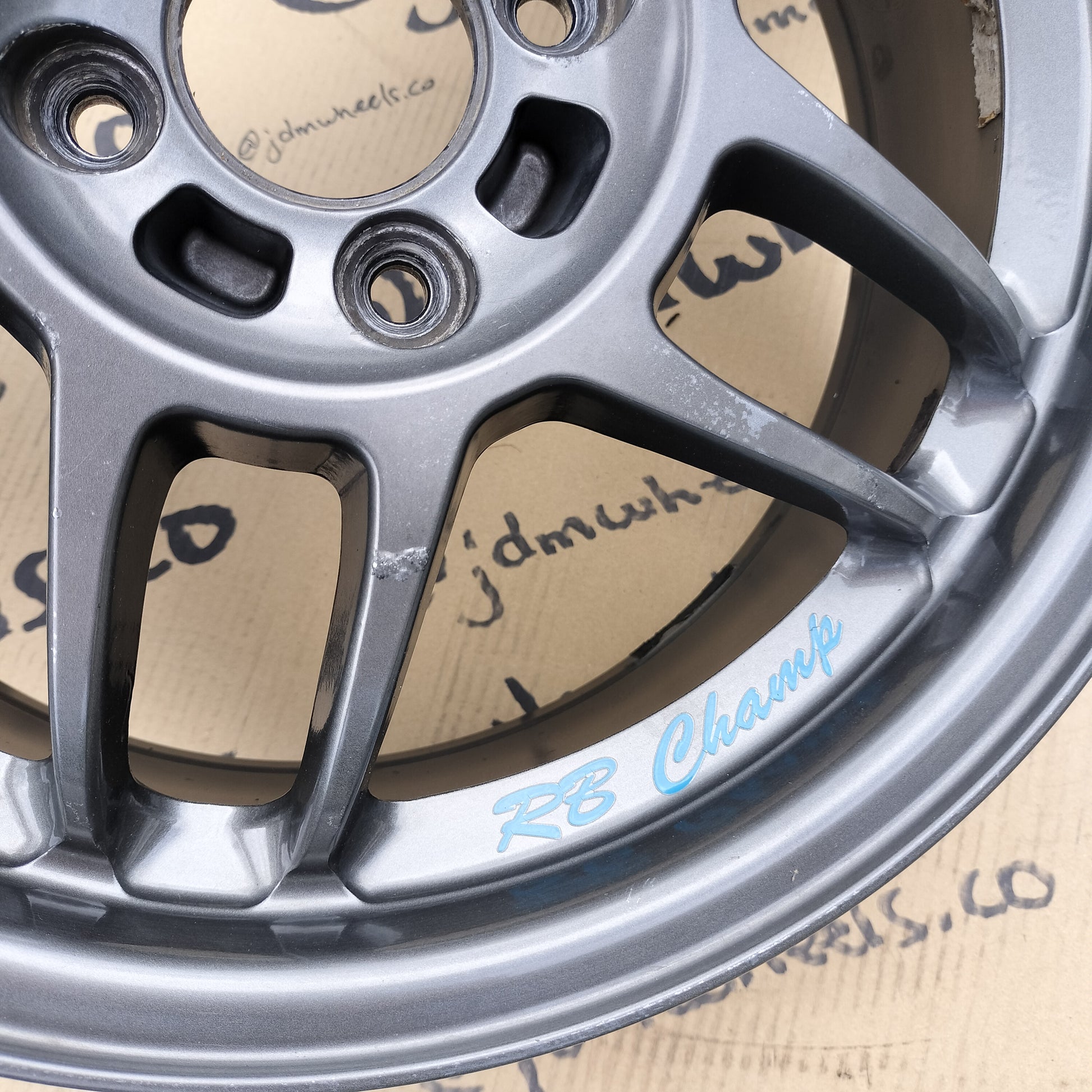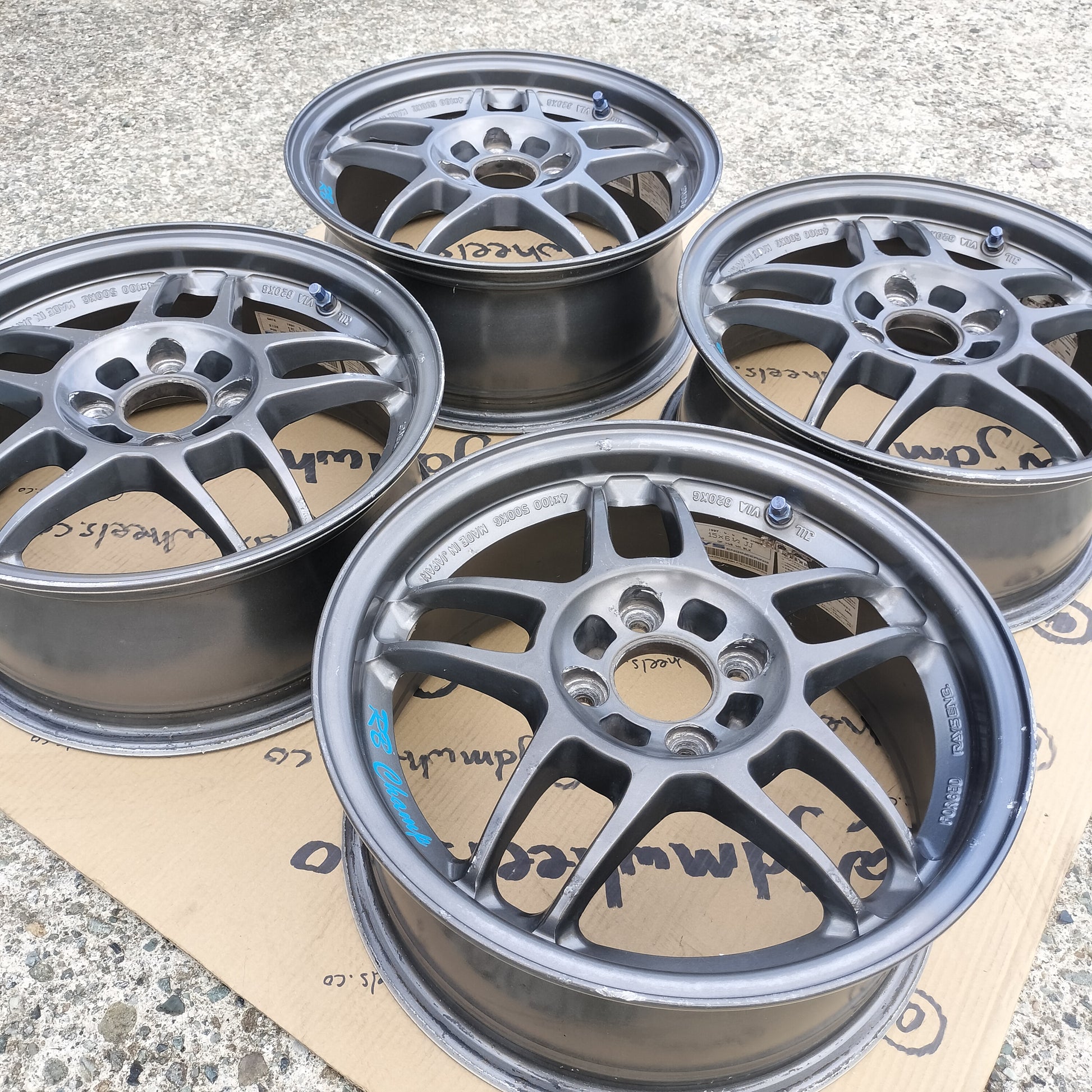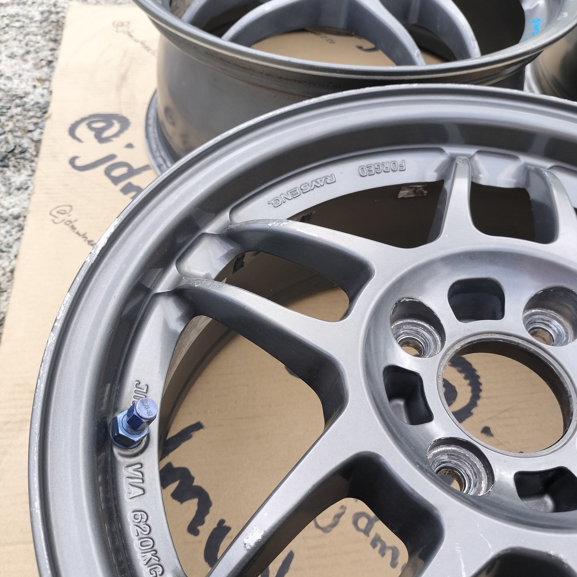 A blast from the past here - made in 1997! Forged construction. They have nicks, scratches, some rubs, and some discoloration. Originally black as indicated by the sticker but they'ved faded other the years and are now a gunmetal-ish grey. Most notable is the bubbling and failing finish. They'd need refinished to be perfect but they could be ran an is if you're not worried about it. Really neat split five spoke design with the pockets around the lug holes.