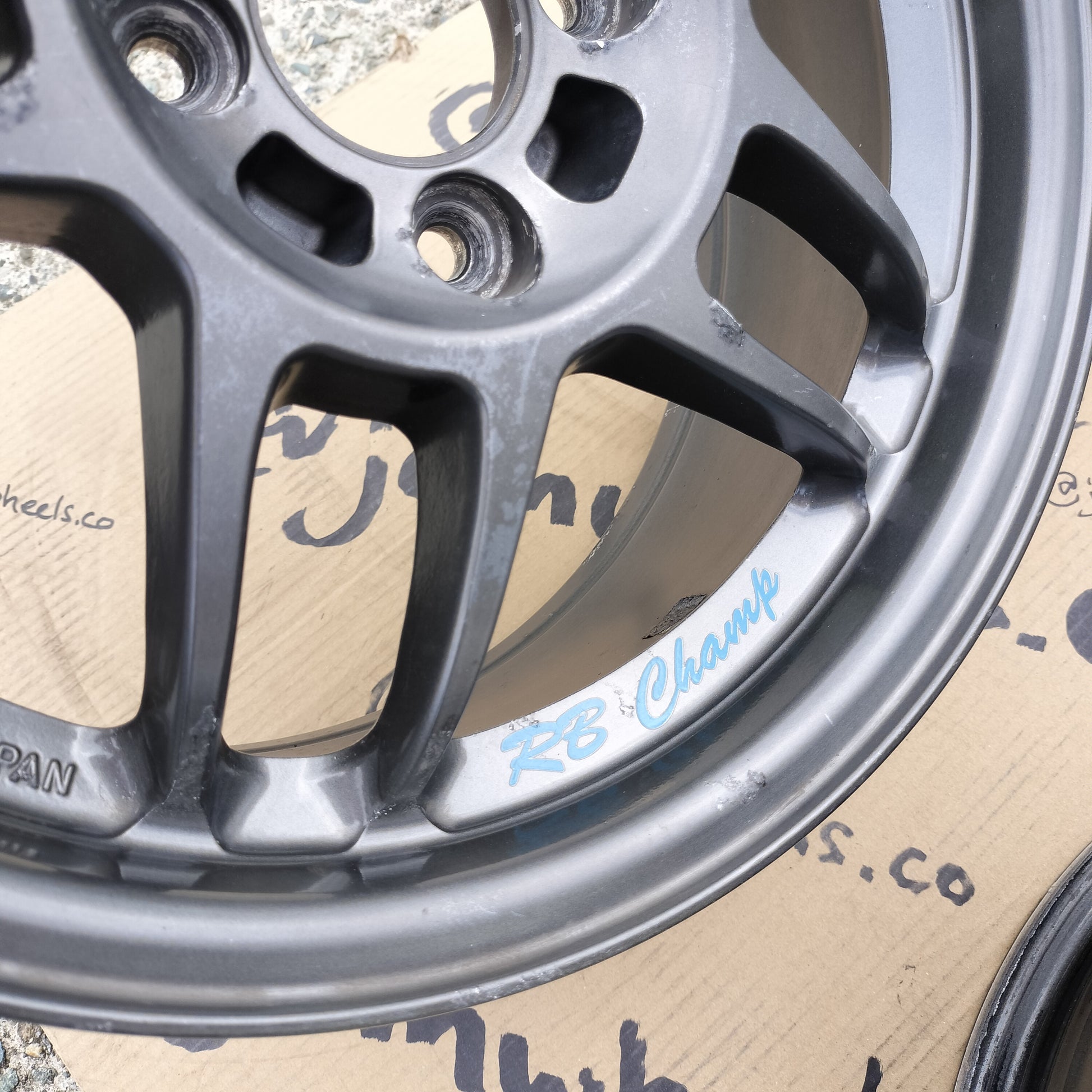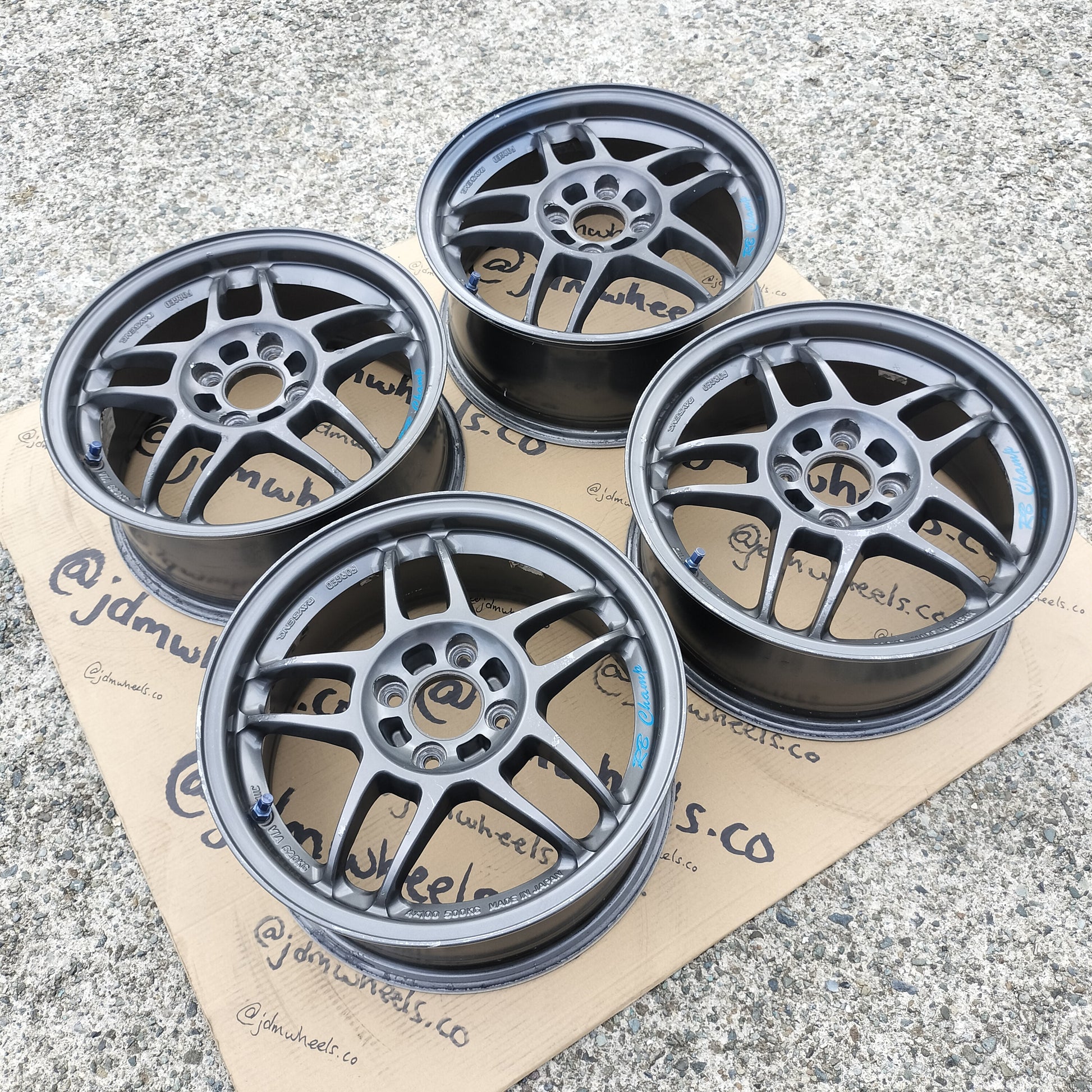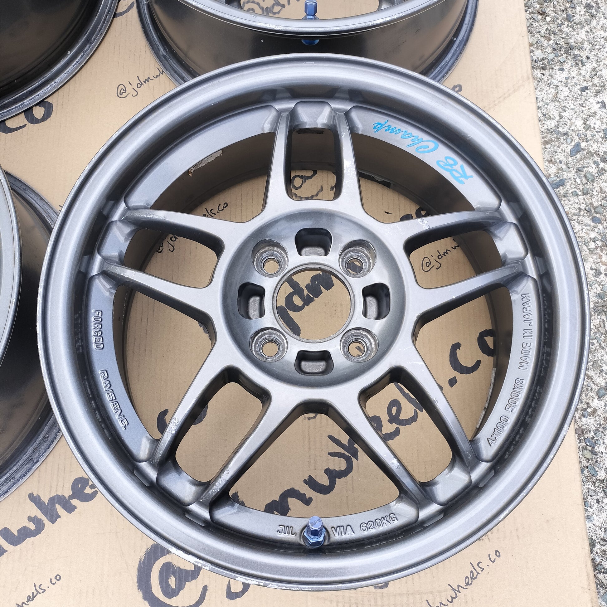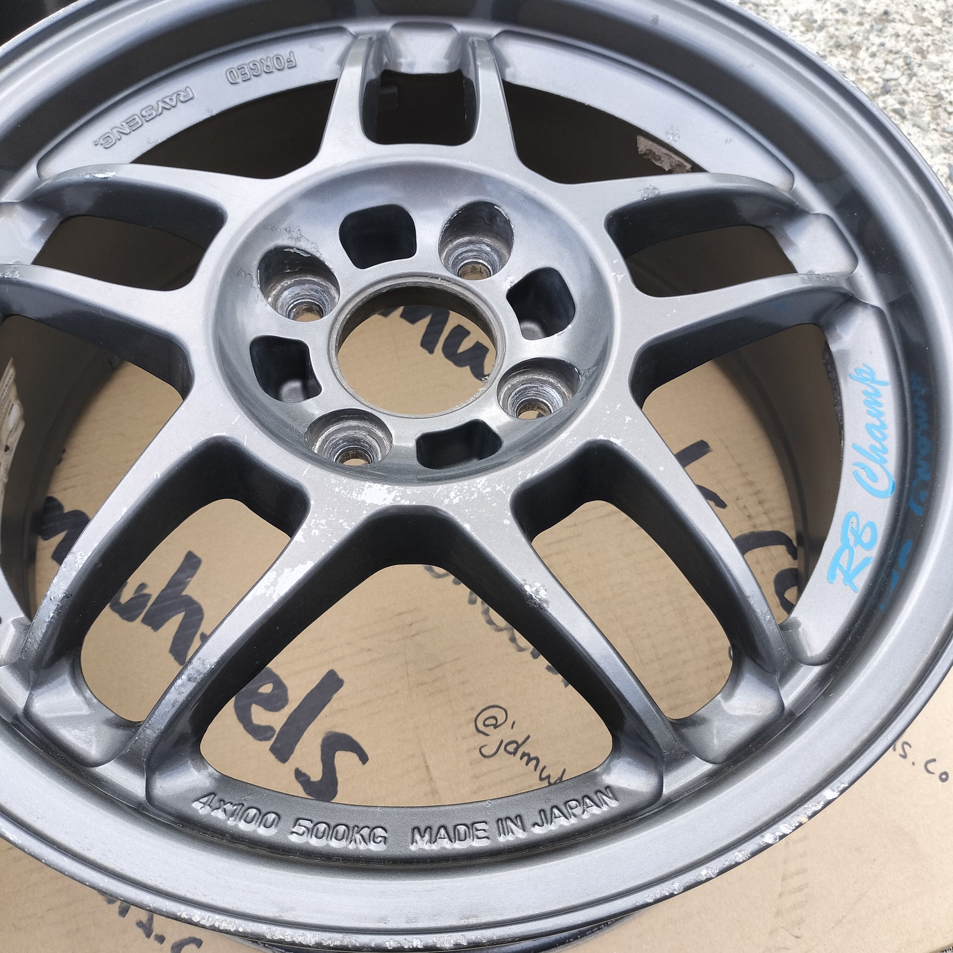 A blast from the past here - made in 1997! Forged construction. They have nicks, scratches, some rubs, and some discoloration. Originally black as indicated by the sticker but they'ved faded other the years and are now a gunmetal-ish grey. Most notable is the bubbling and failing finish. They'd need refinished to be perfect but they could be ran an is if you're not worried about it. Really neat split five spoke design with the pockets around the lug holes.