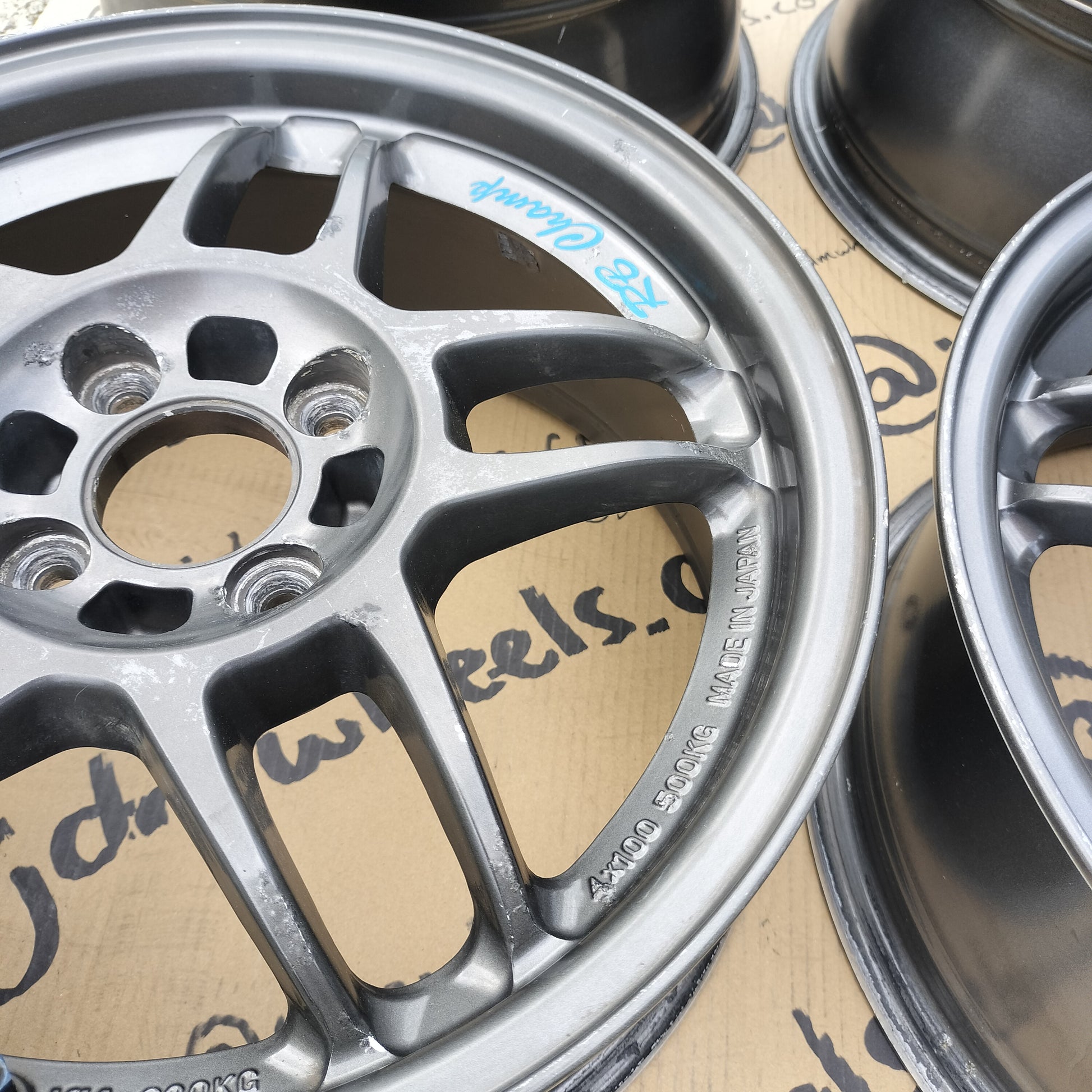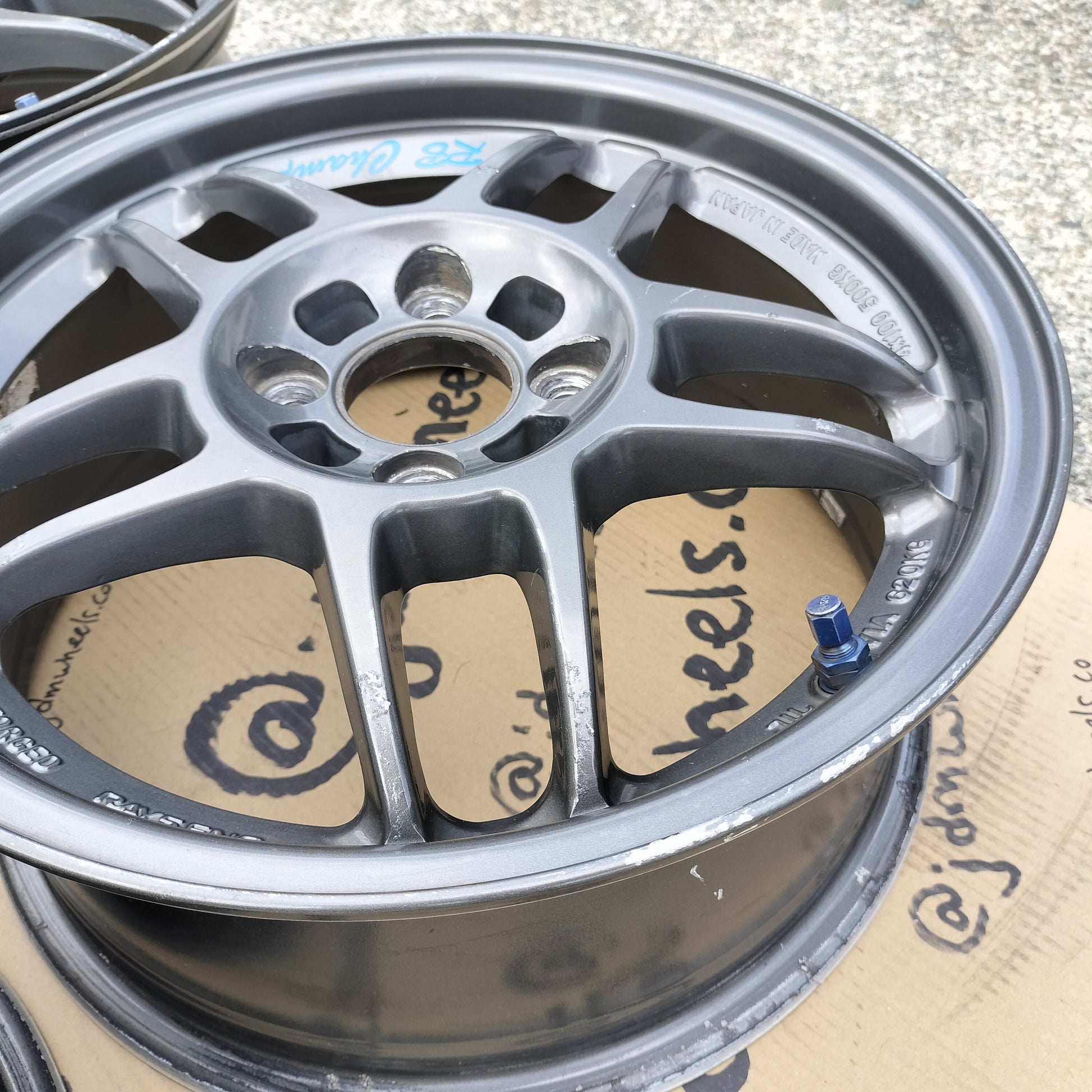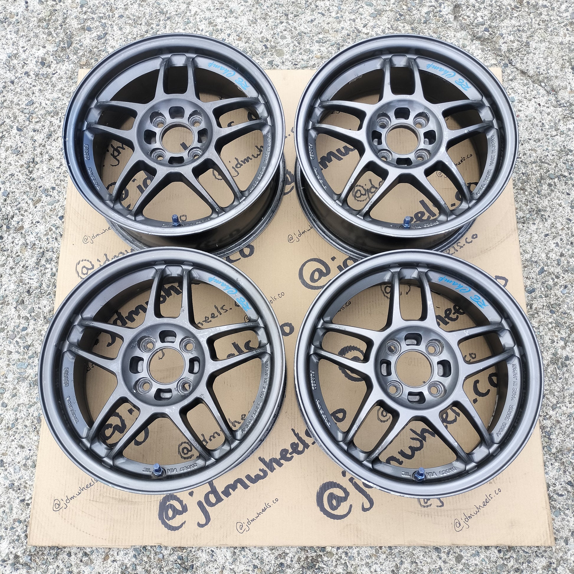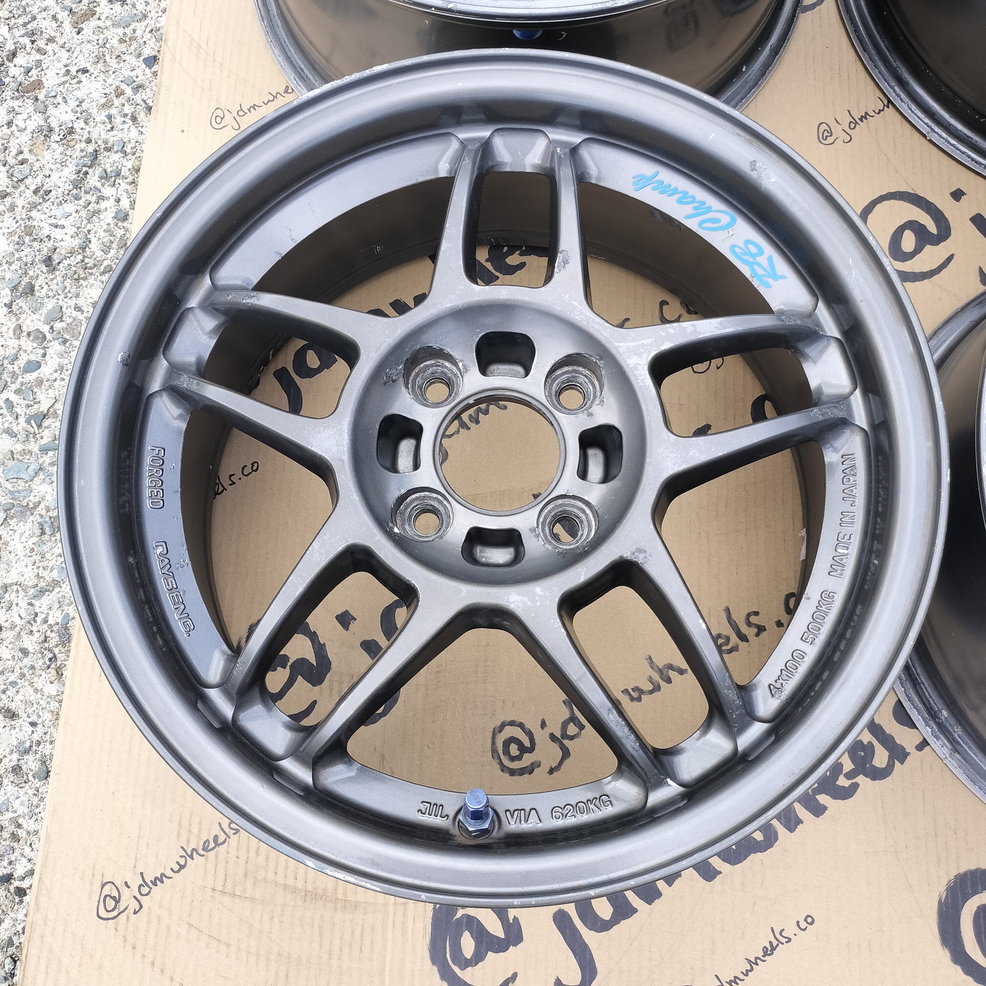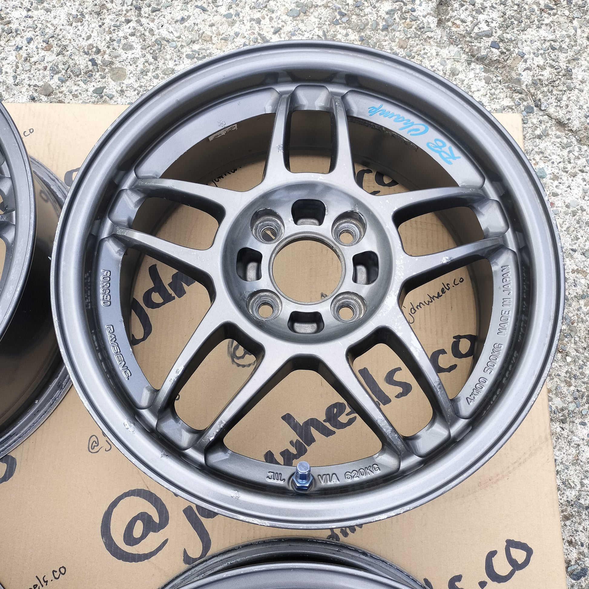 A blast from the past here - made in 1997! Forged construction. They have nicks, scratches, some rubs, and some discoloration. Originally black as indicated by the sticker but they'ved faded other the years and are now a gunmetal-ish grey. Most notable is the bubbling and failing finish. They'd need refinished to be perfect but they could be ran an is if you're not worried about it. Really neat split five spoke design with the pockets around the lug holes.