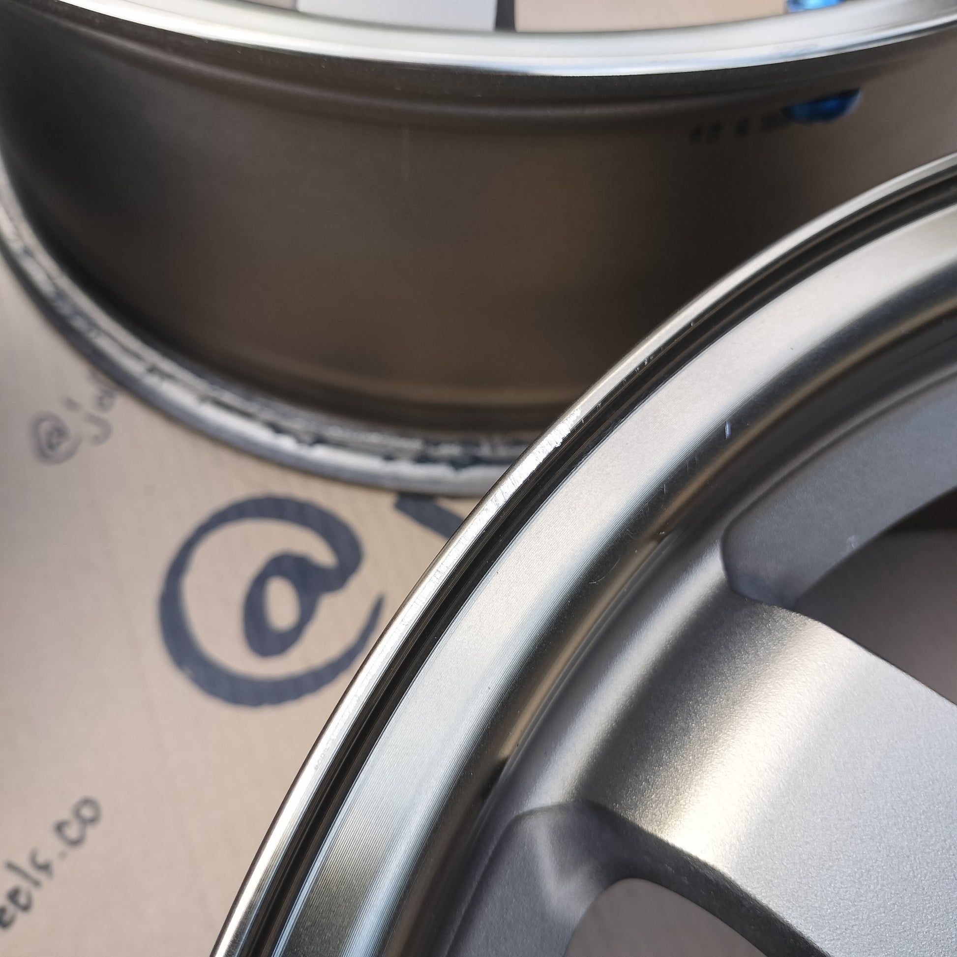 One wheel has light grazing type rash on a quarter of it (upper left wheel in group pic; and the 5th & 6th picture is from two different angles). And one wheel has a two-ish inch (50-ish mm) spot of light grazing rash (bottom right wheel in group pic and 7th pic). It was hard to get them to standout in the pictures.