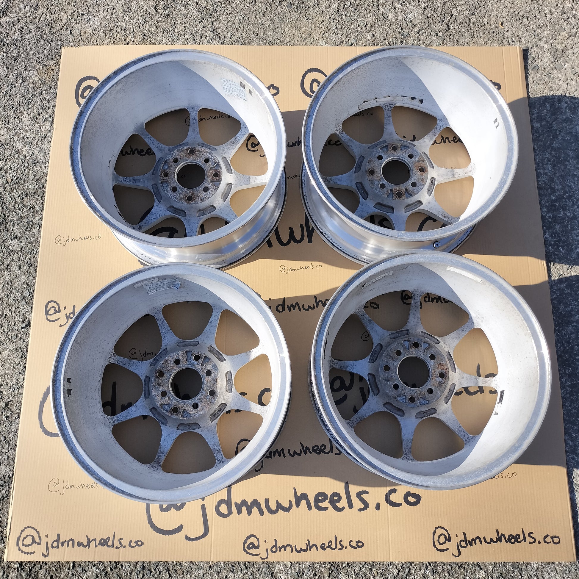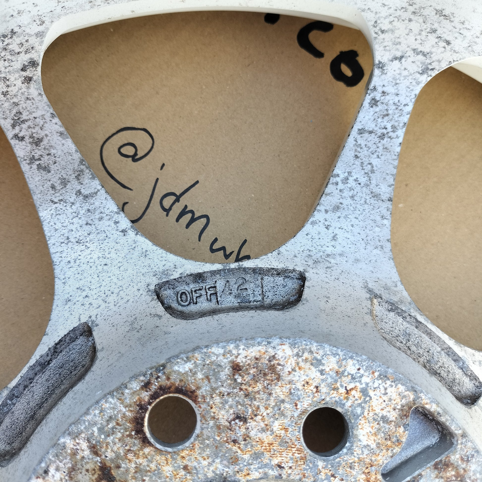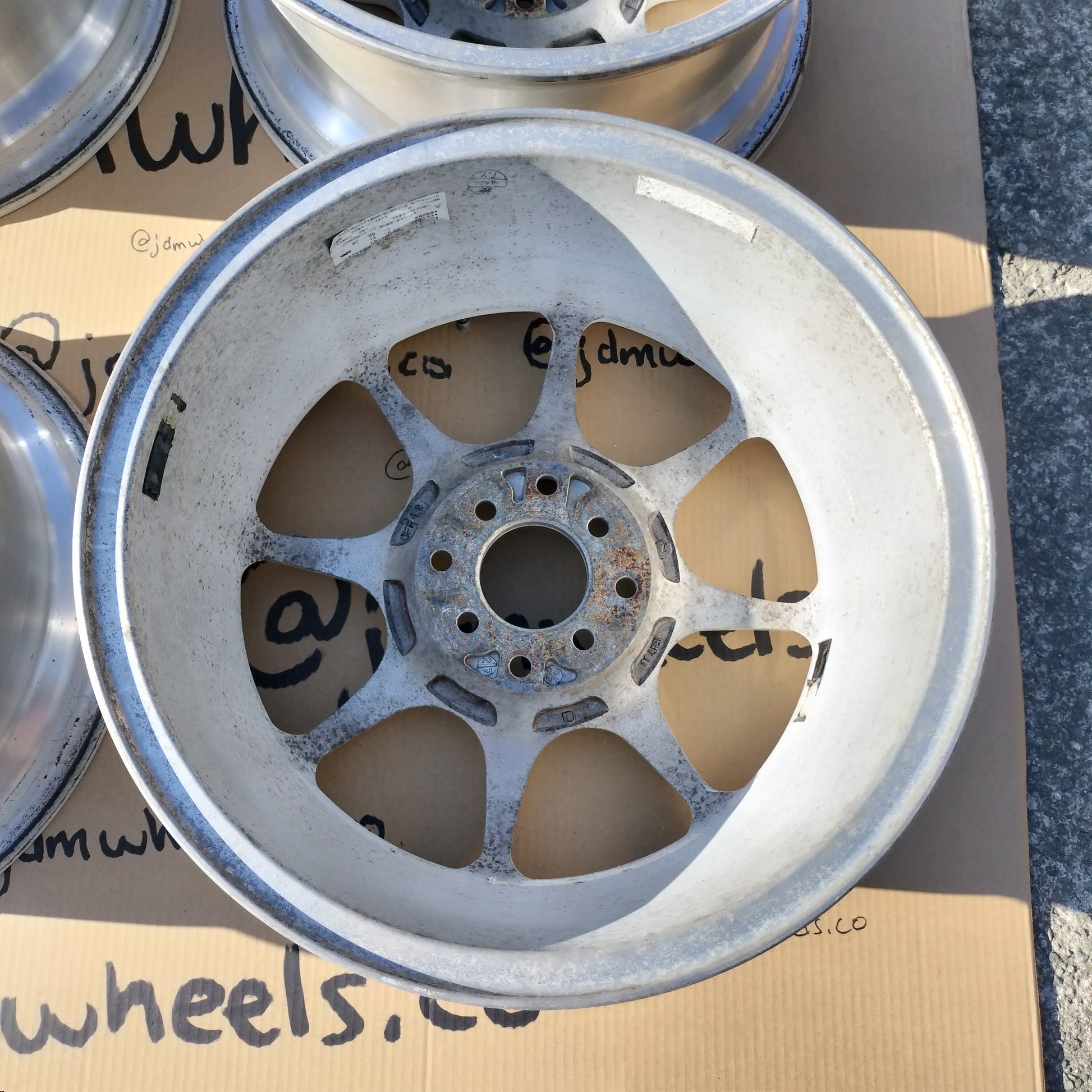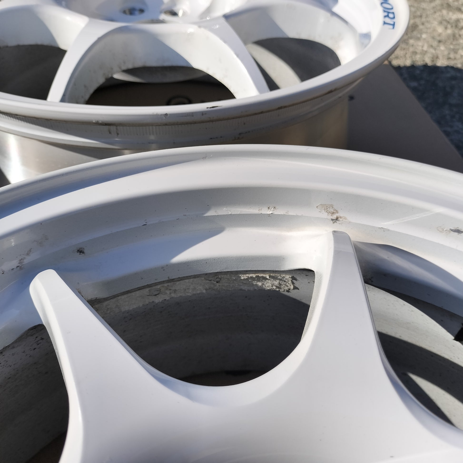 No rash on these babies but the finish is bubbling/flaking in places and there is some staining. Weds used a VERY thin surface coating on TC05's and it was not applied on "unnecessary areas", like between the bead where you can see it is still shiny aluminum. Combine the lightweight coating with the knurling on the barrels and it's clear Weds built these with motorsports in mind!