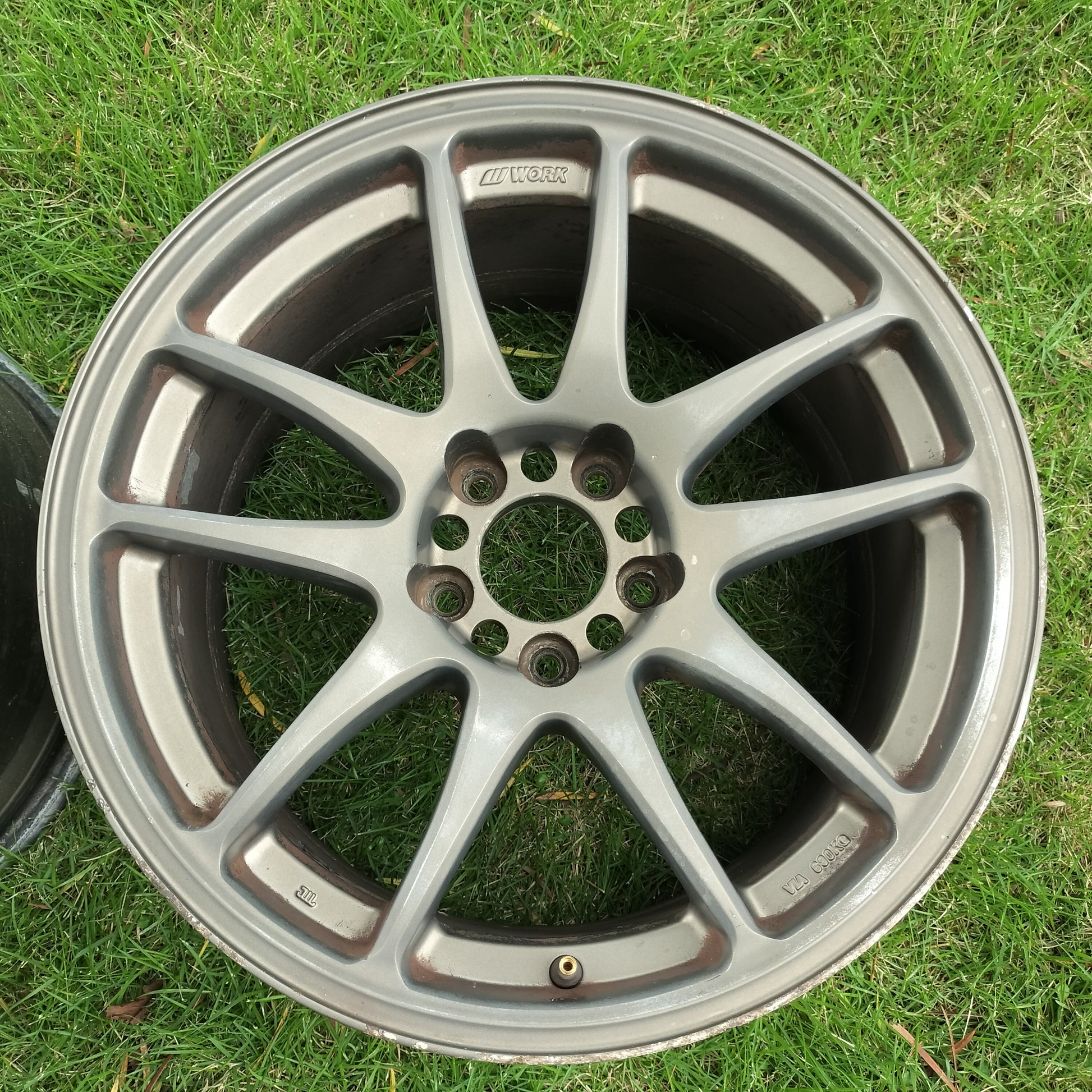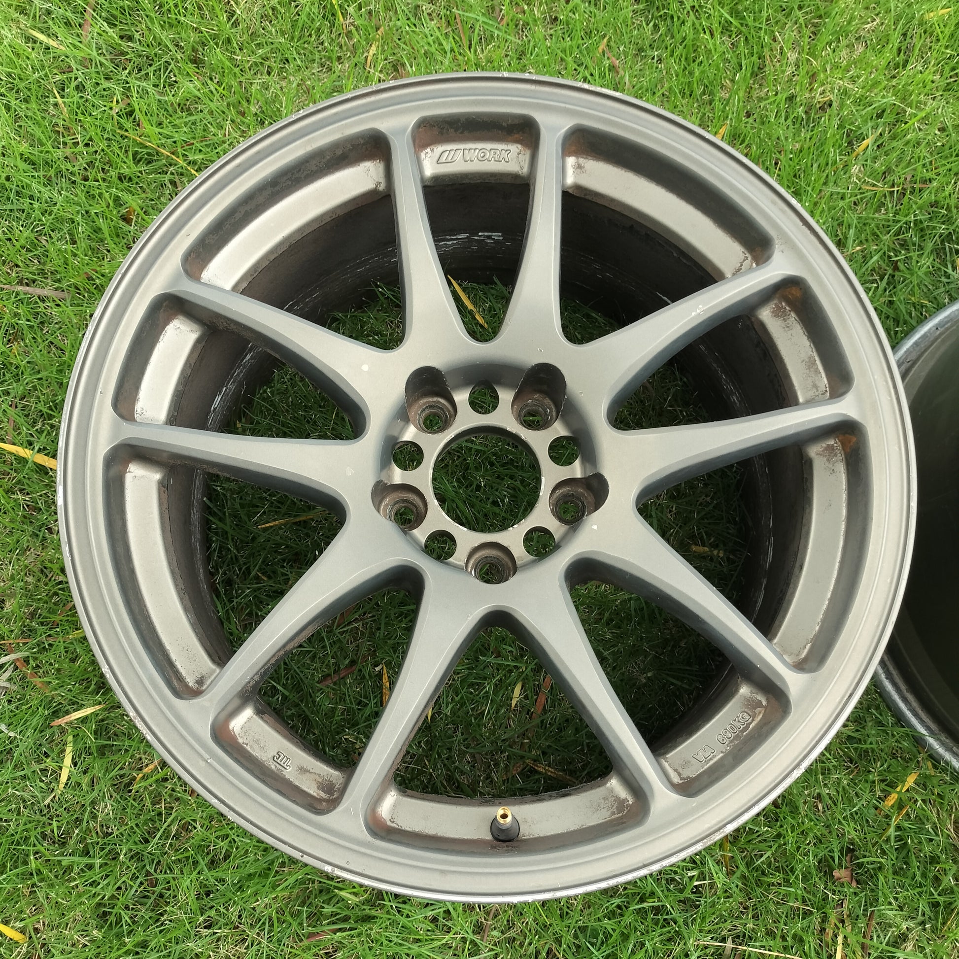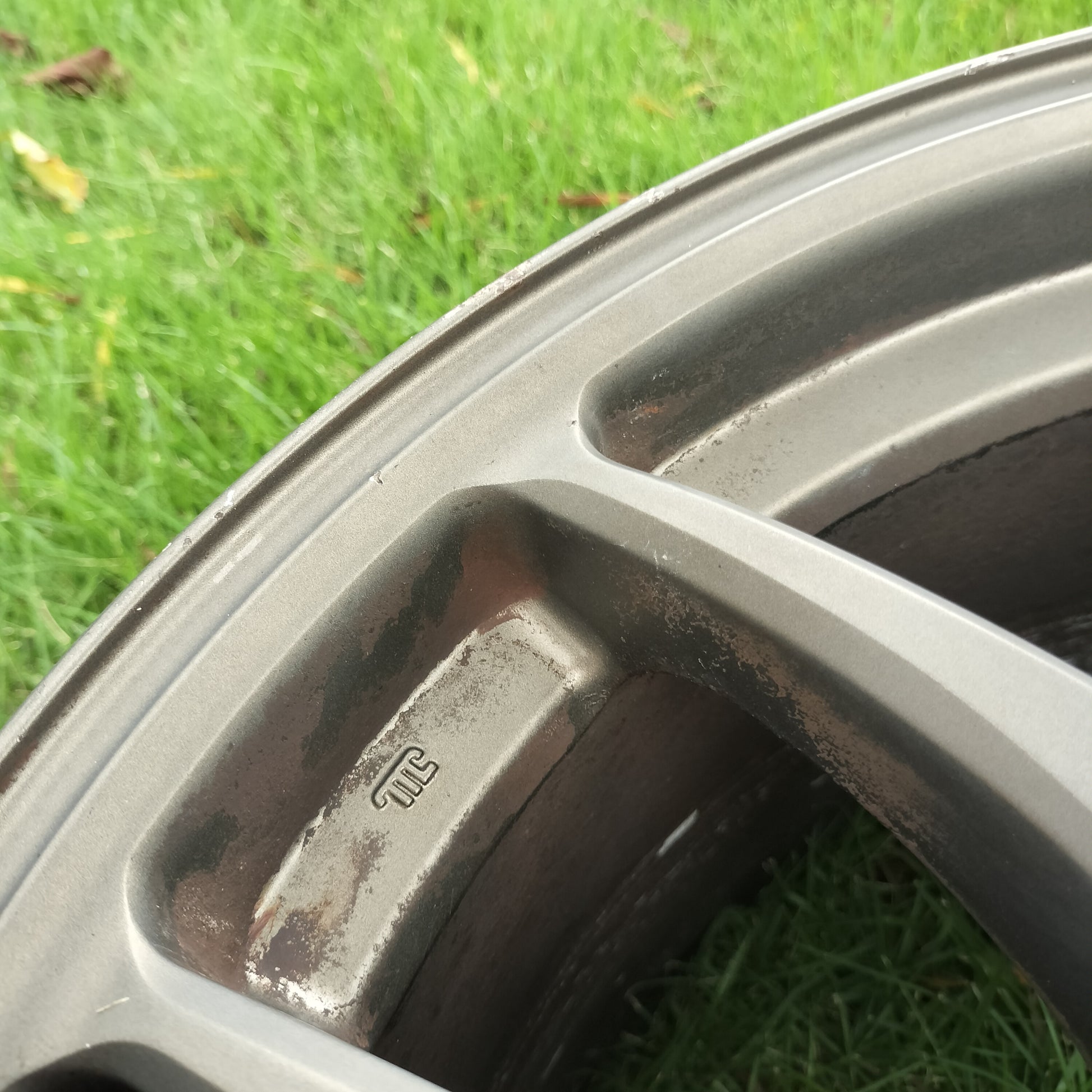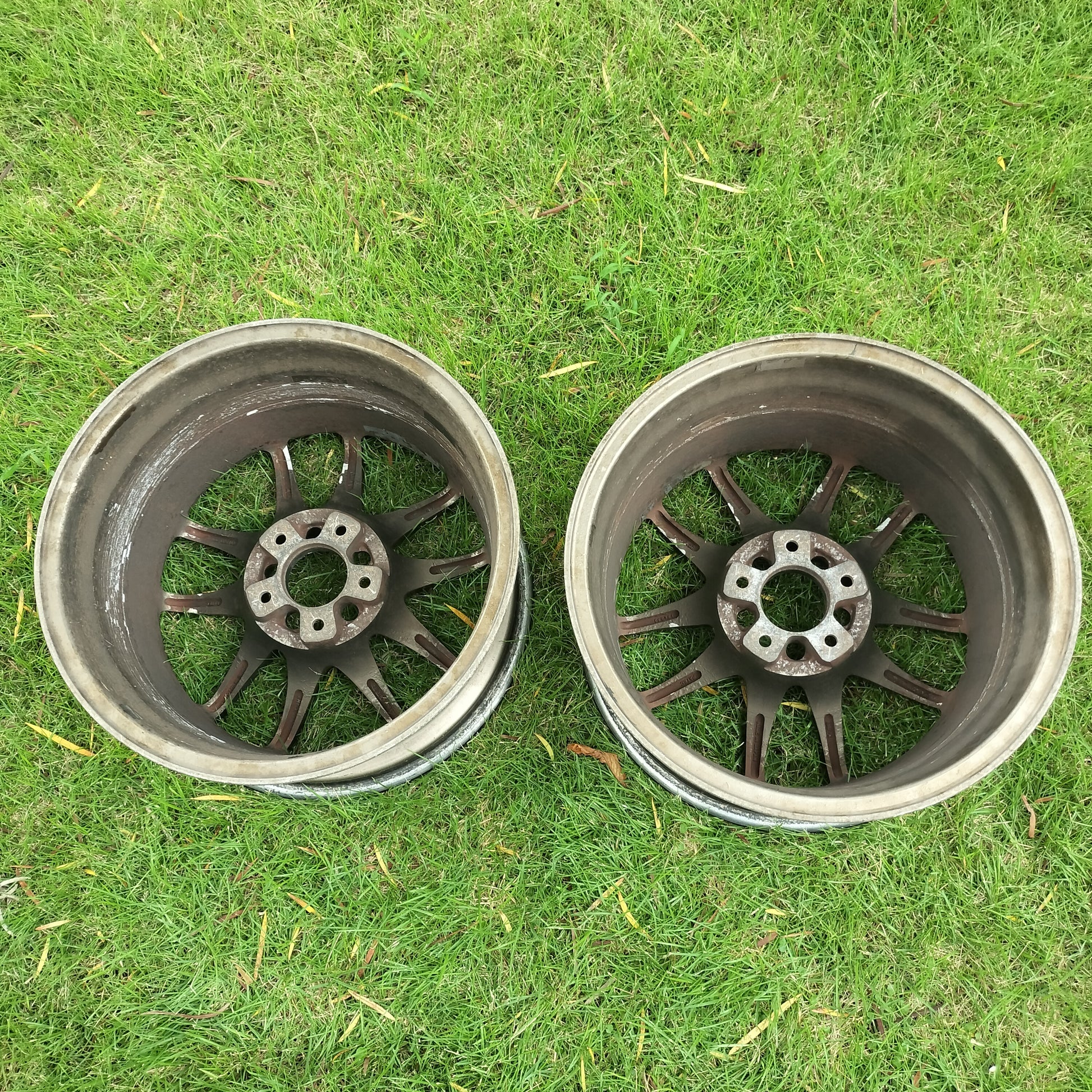 These need to be refinished or used as is as a low stress pair. There's some light rash/rubbing, color fading, hard caked on brake dust and some finish flaking on the inside.