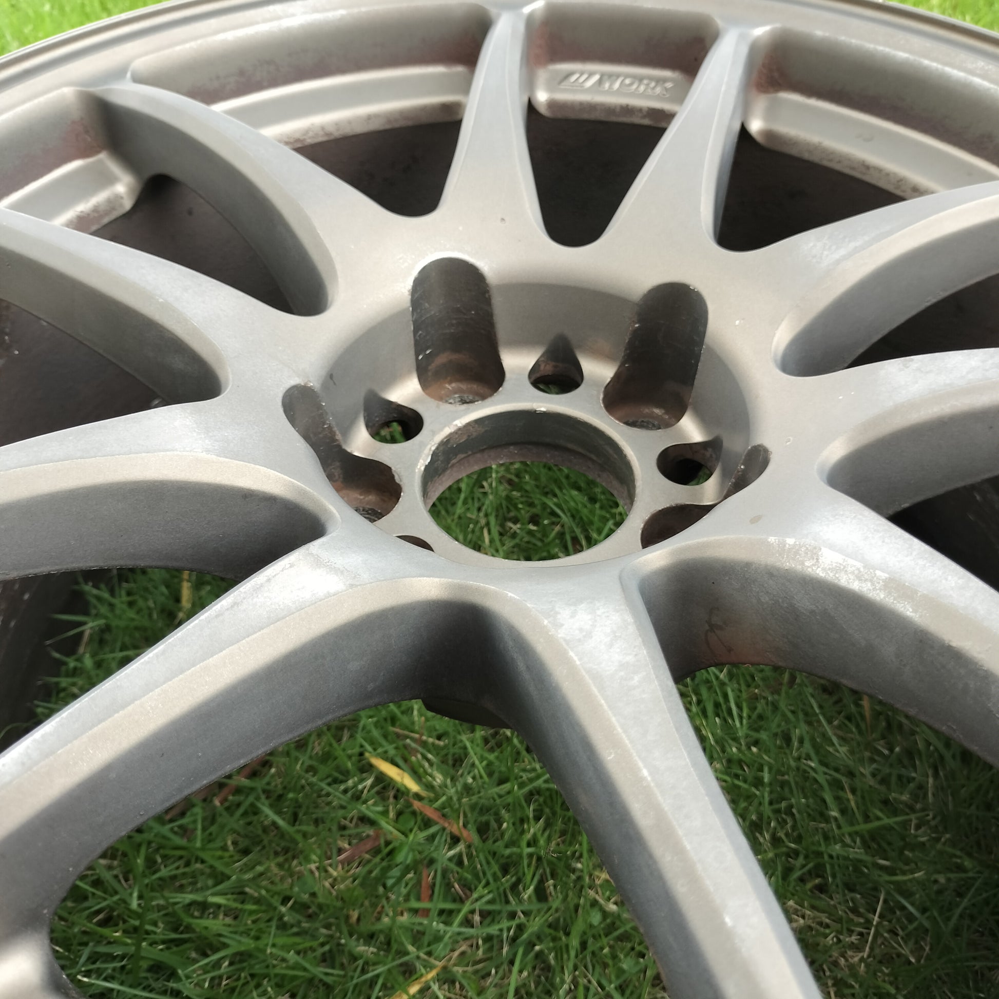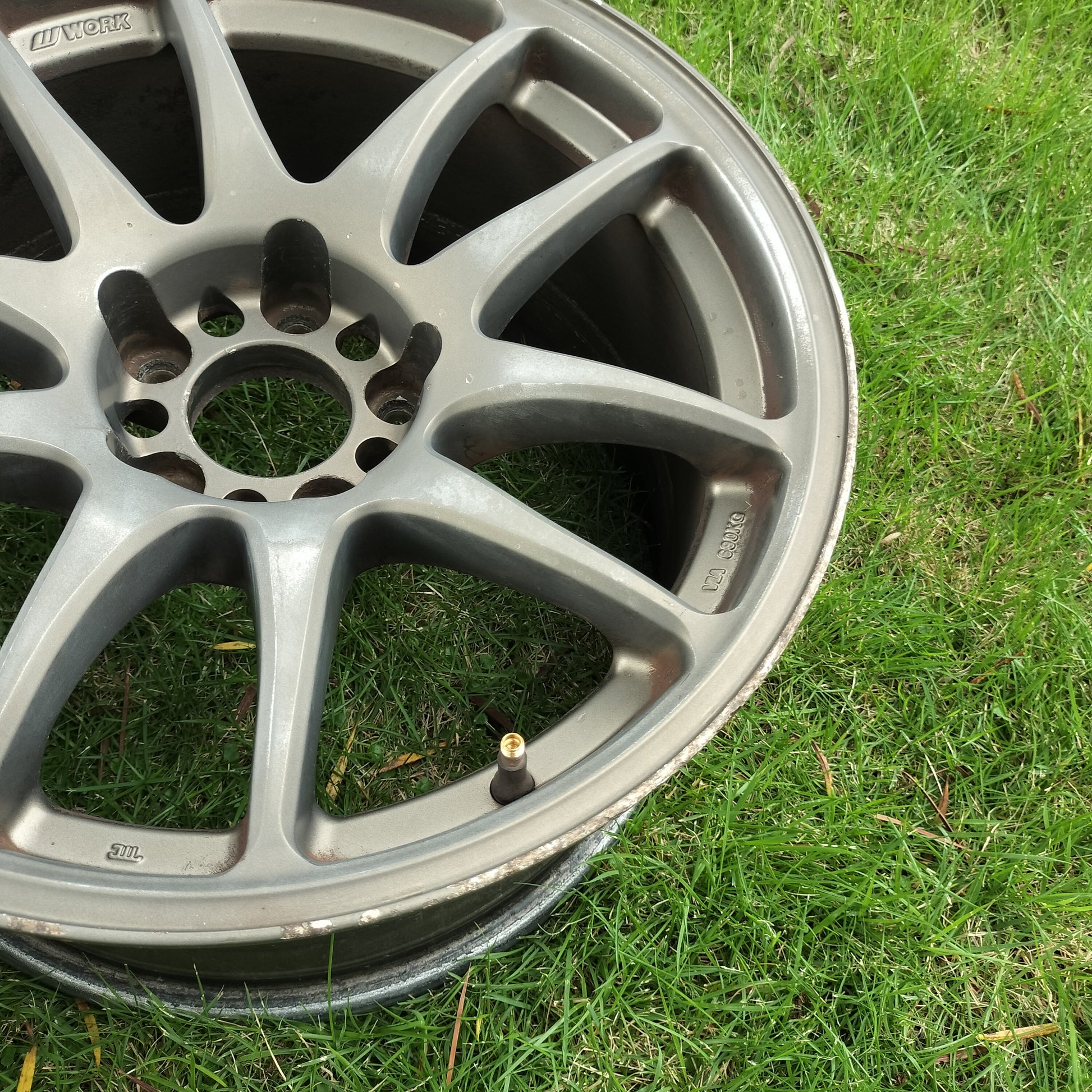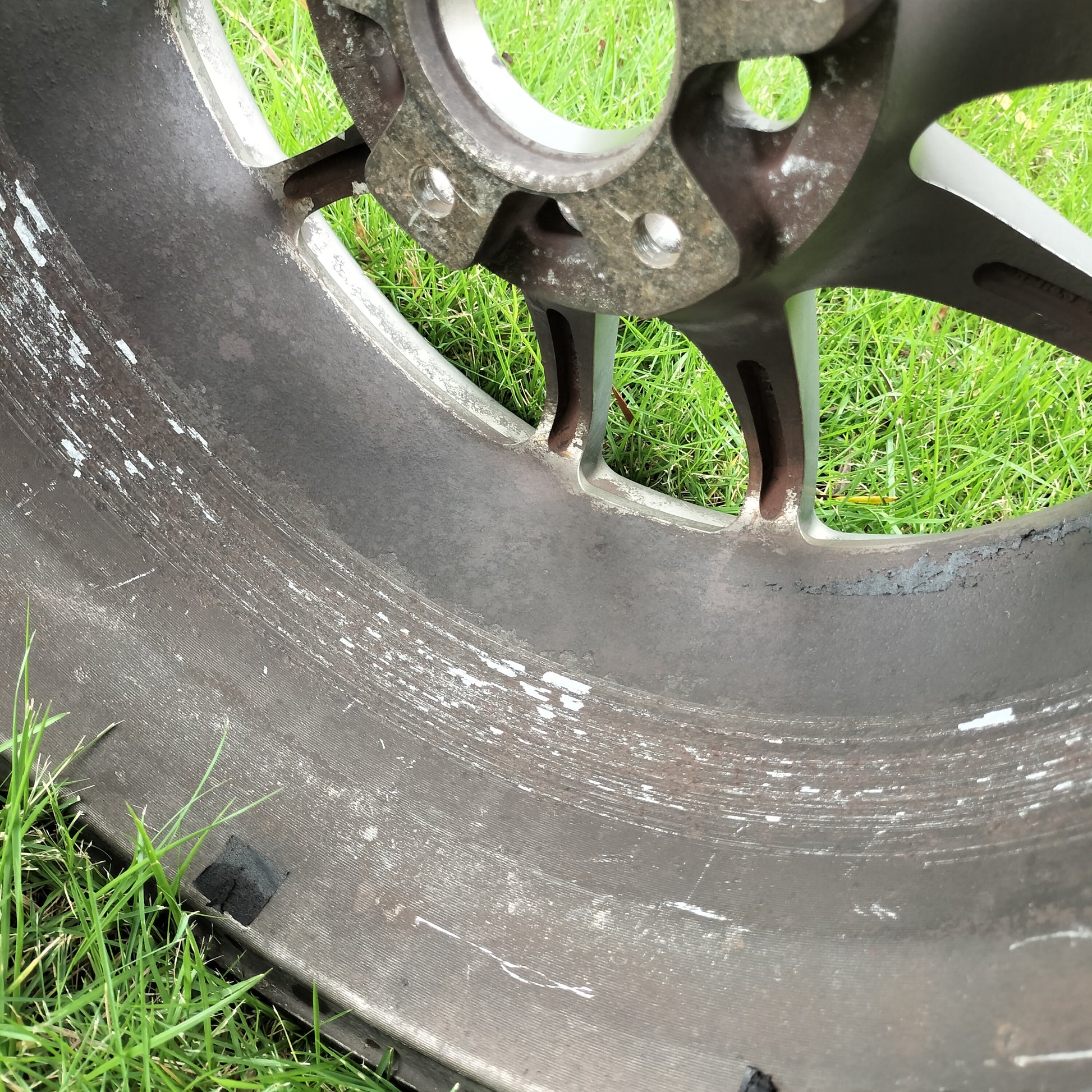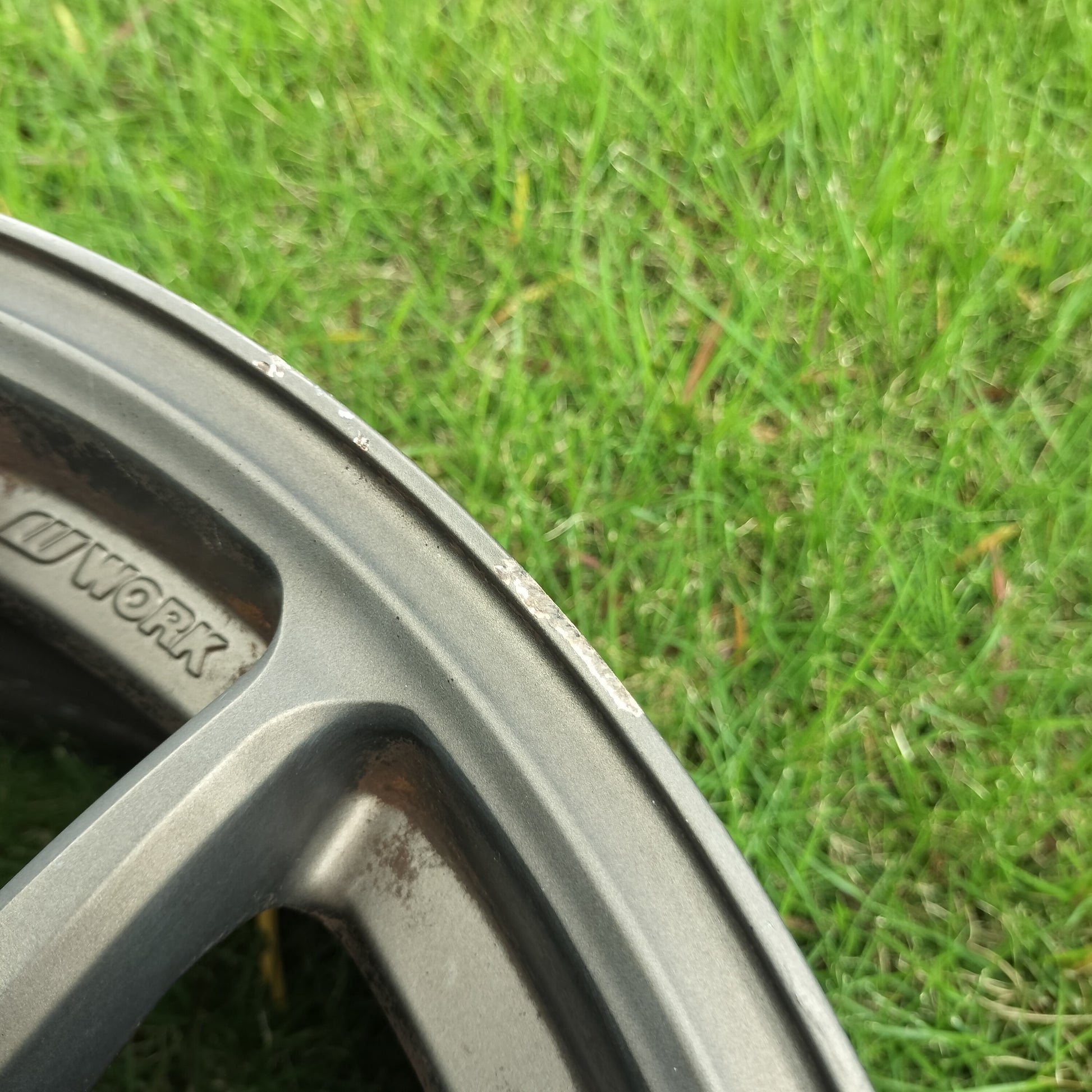 These need to be refinished or used as is as a low stress pair. There's some light rash/rubbing, color fading, hard caked on brake dust and some finish flaking on the inside.