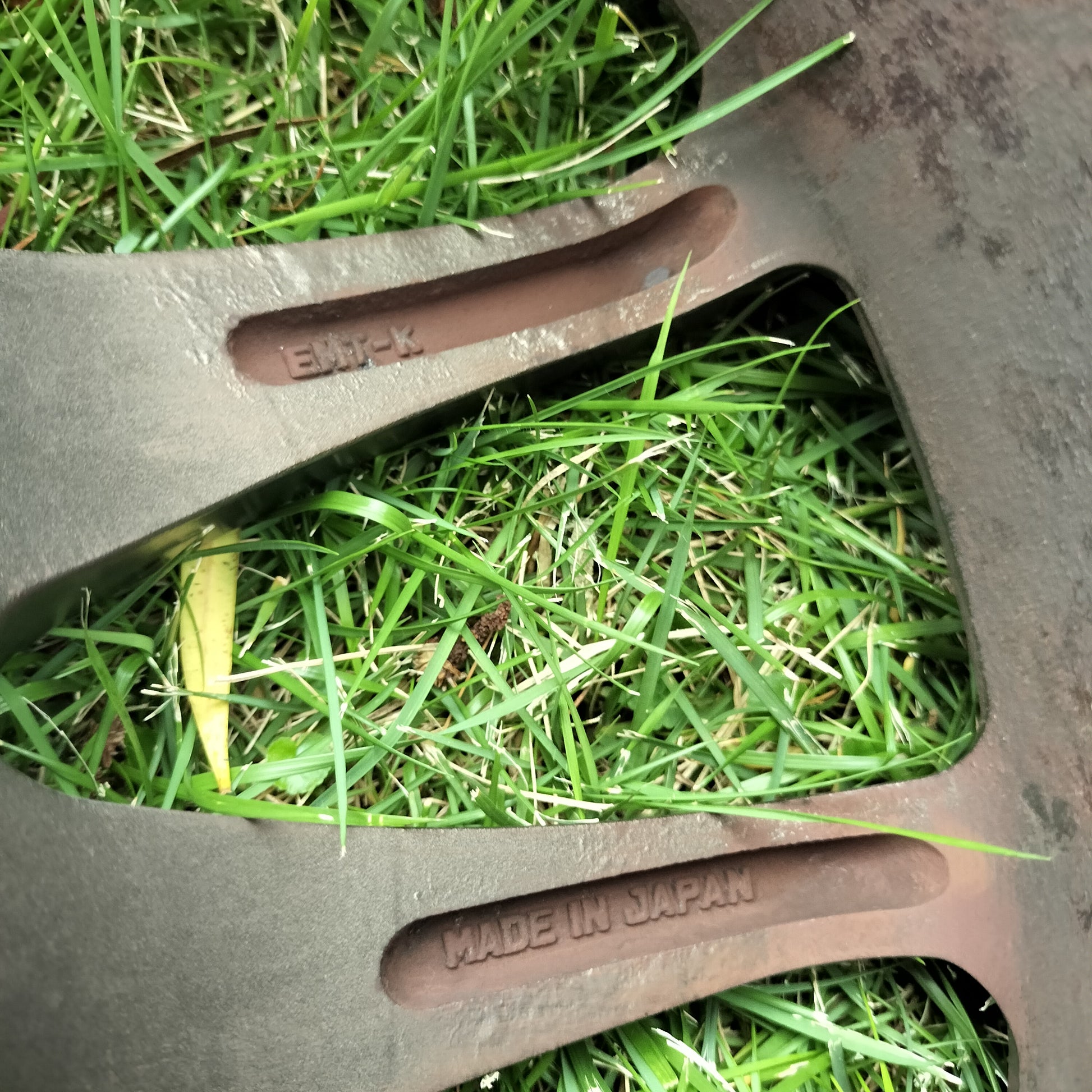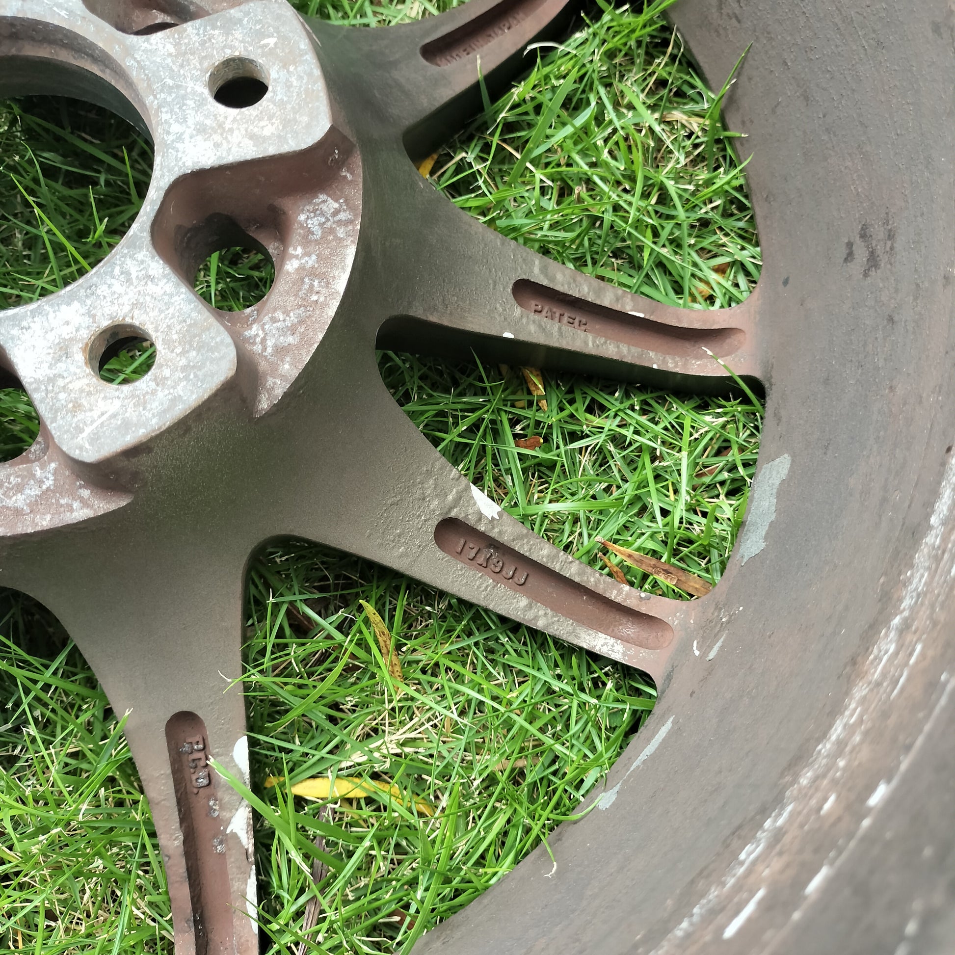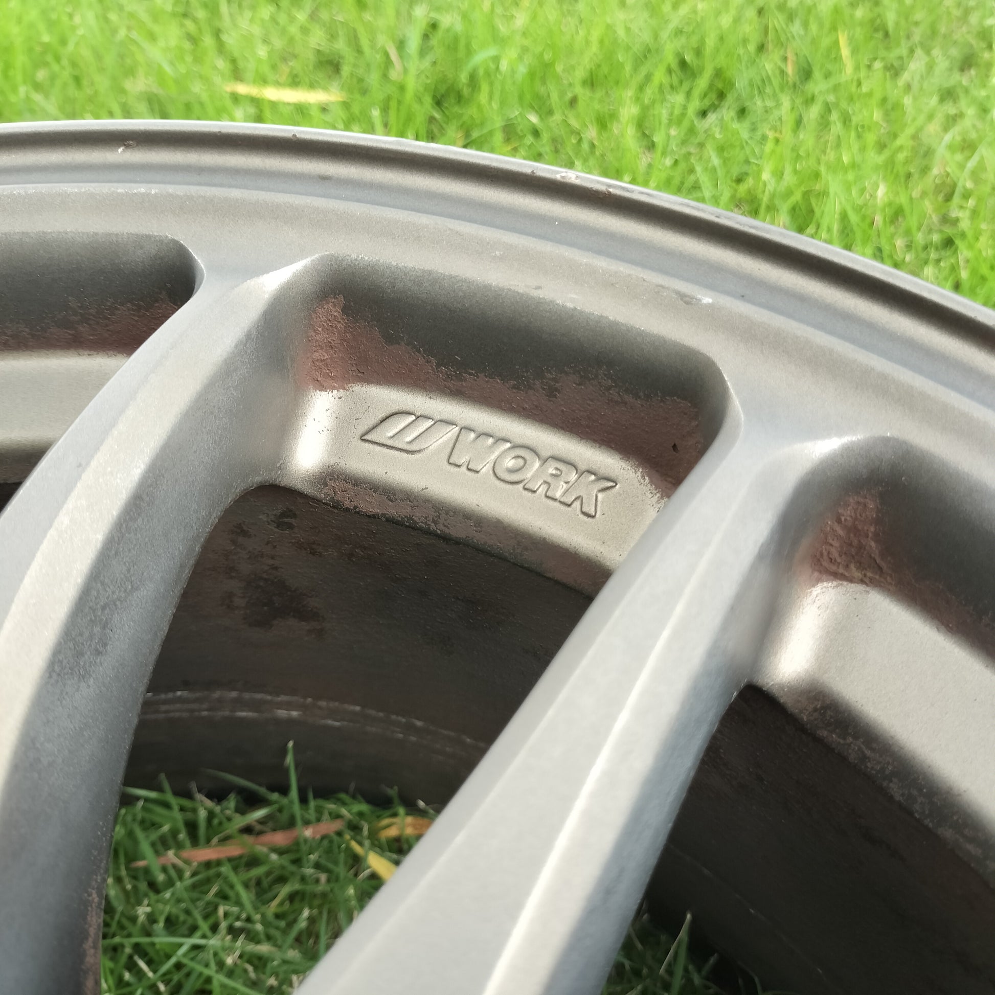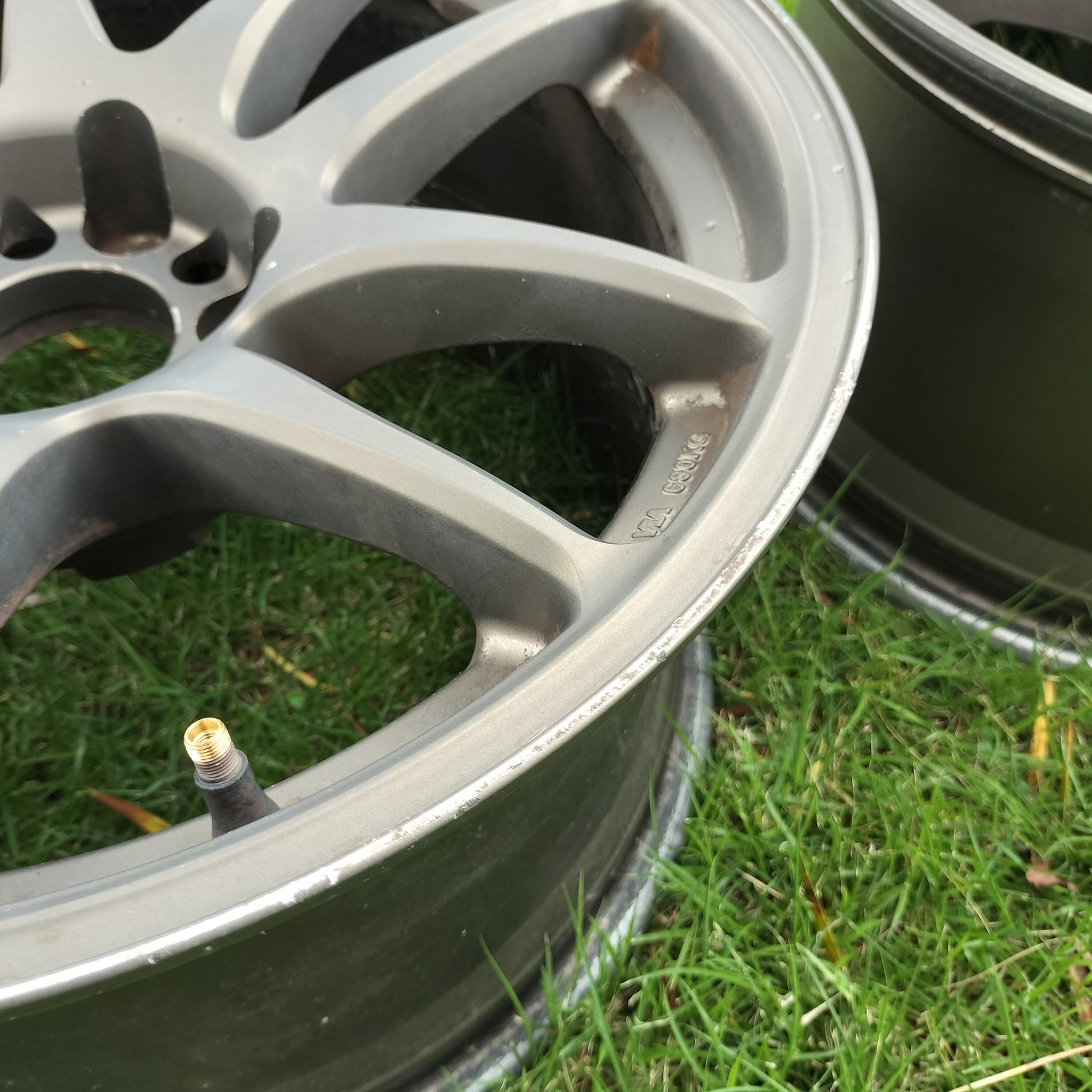 These need to be refinished or used as is as a low stress pair. There's some light rash/rubbing, color fading, hard caked on brake dust and some finish flaking on the inside.